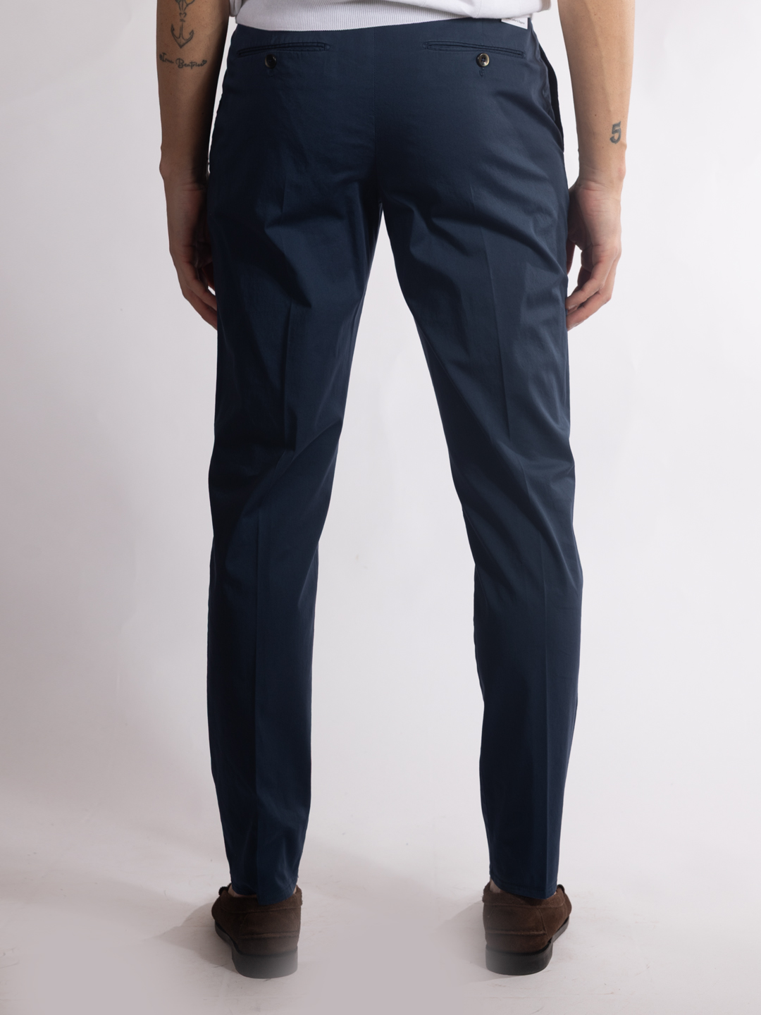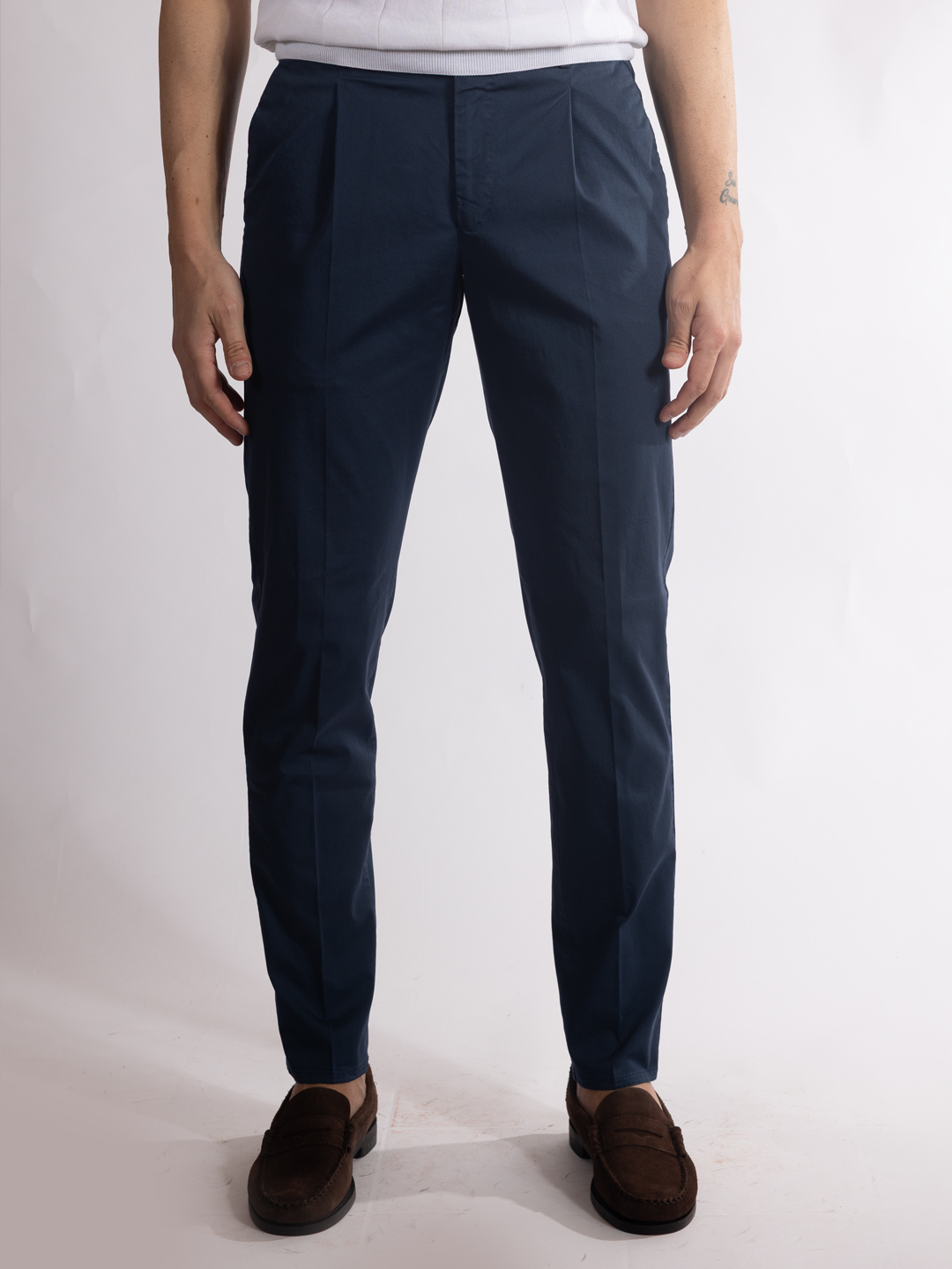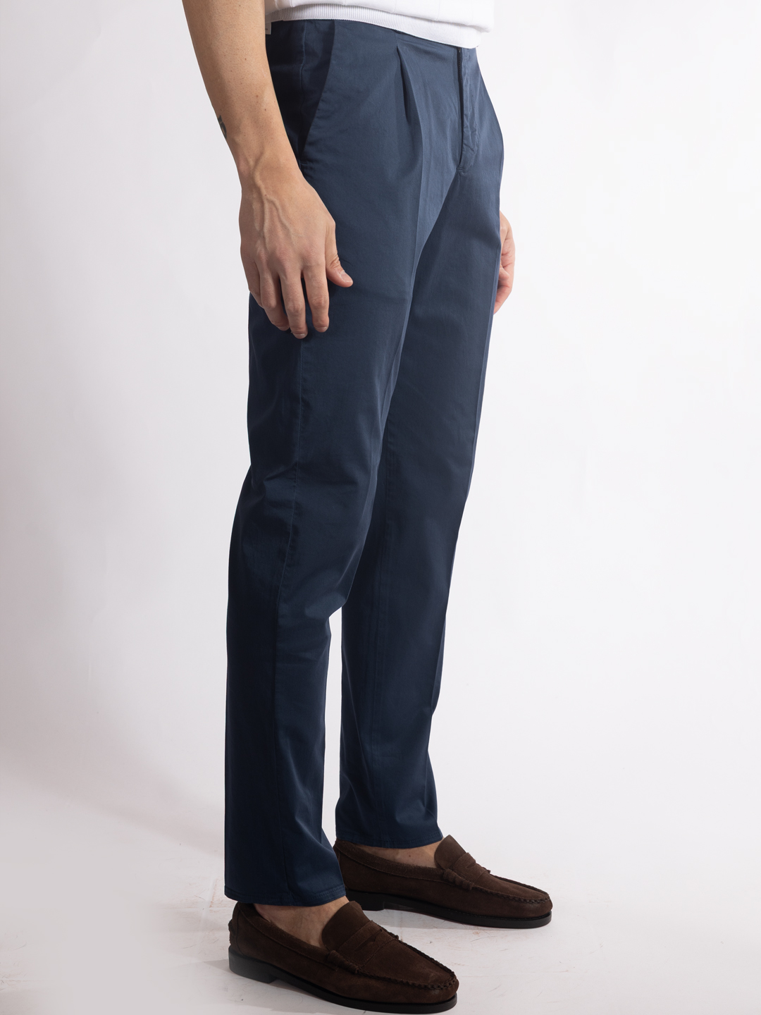 Pantalone con piega stirata, pinces frontali, tasche laterali a filo e tasche posteriori a filetto.