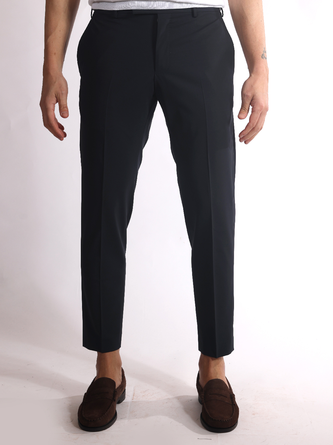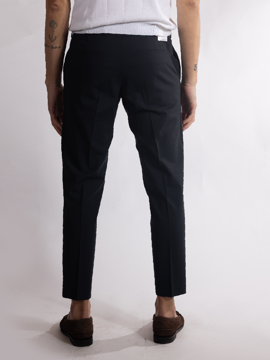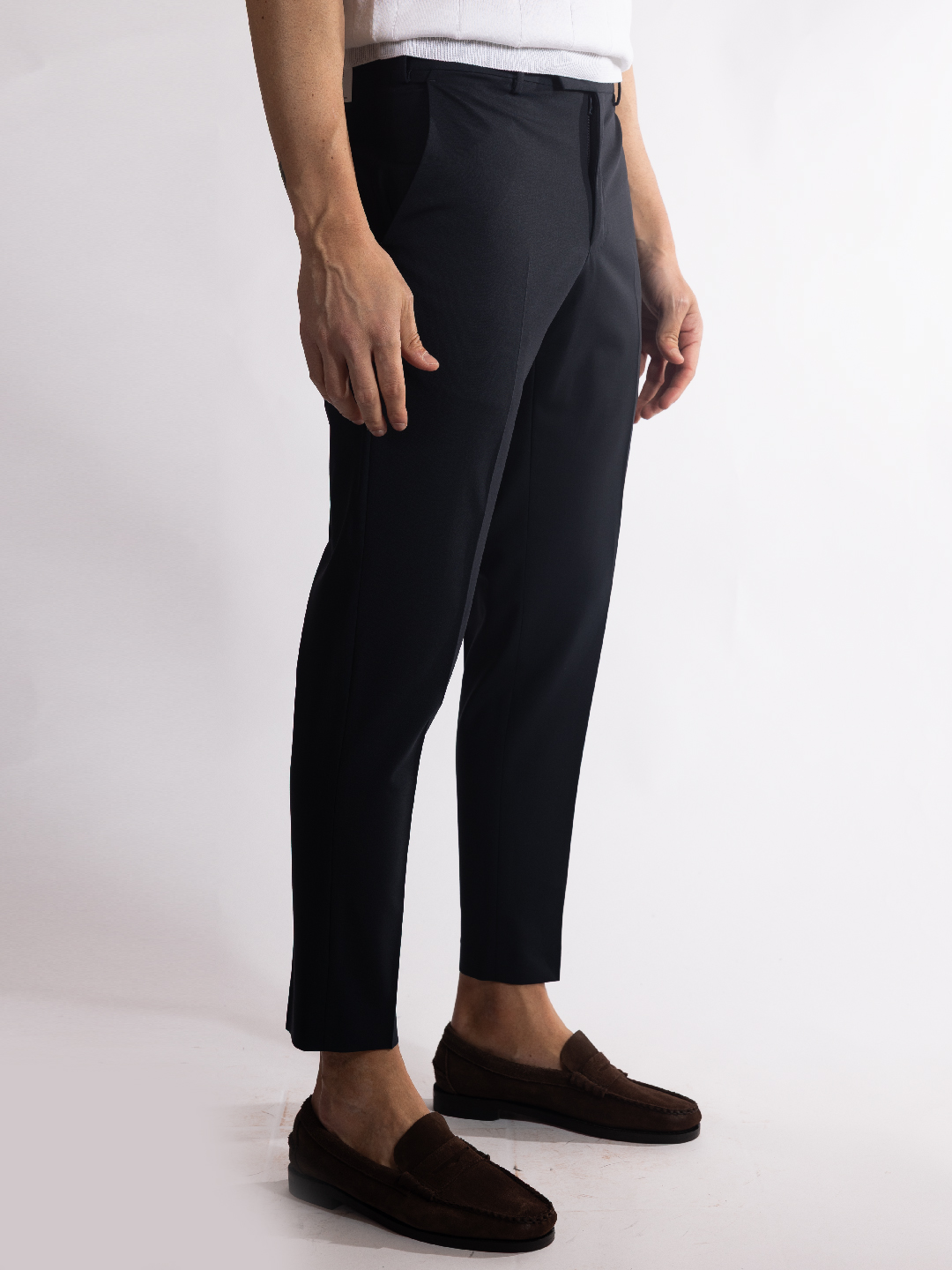 Pantalone slim fit con piega stirata centrale, chiusura frontale con zip e bottone nascosto, tasche laterali inclinate a filo e tasche posteriori a doppio filetto.