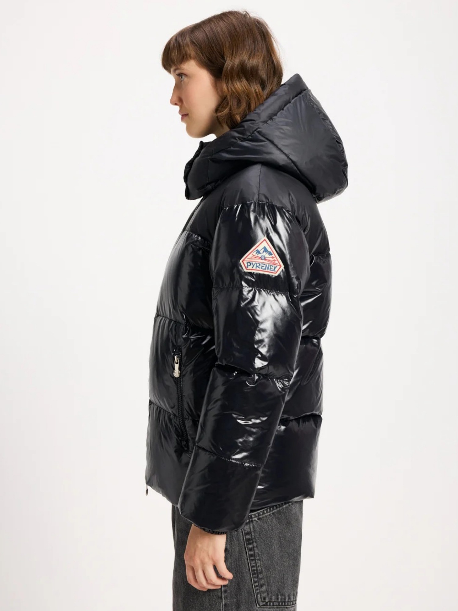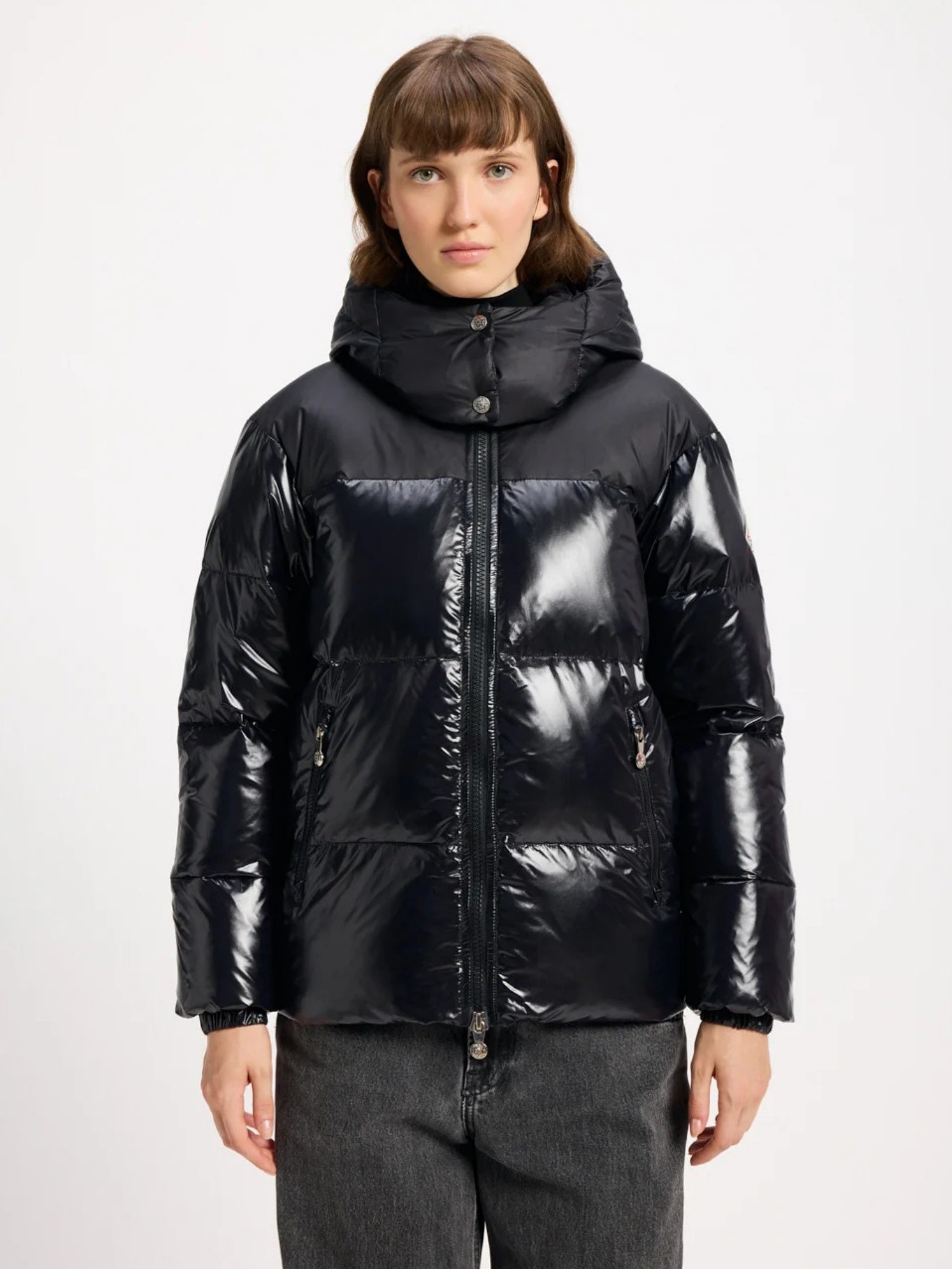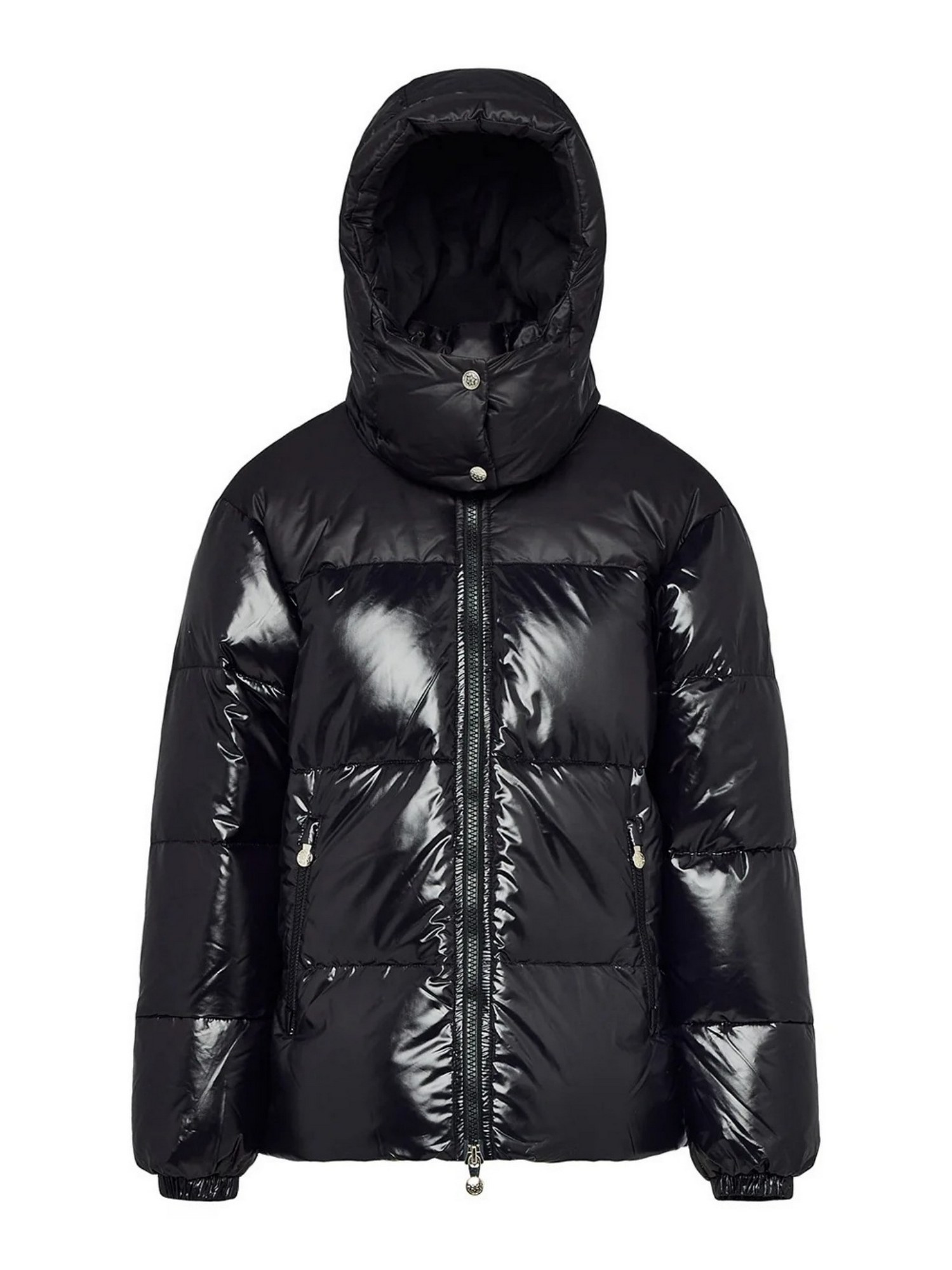 Piumino in tessuto lucido e idrorepellente, cerniera anteriore con doppio cursore e alette inferiori, due tasche con cerniera e fodera in tricot spazzolato, tasca interna con cerniera, cappuccio rimovibile con cerniera e polsini elasticizzati.