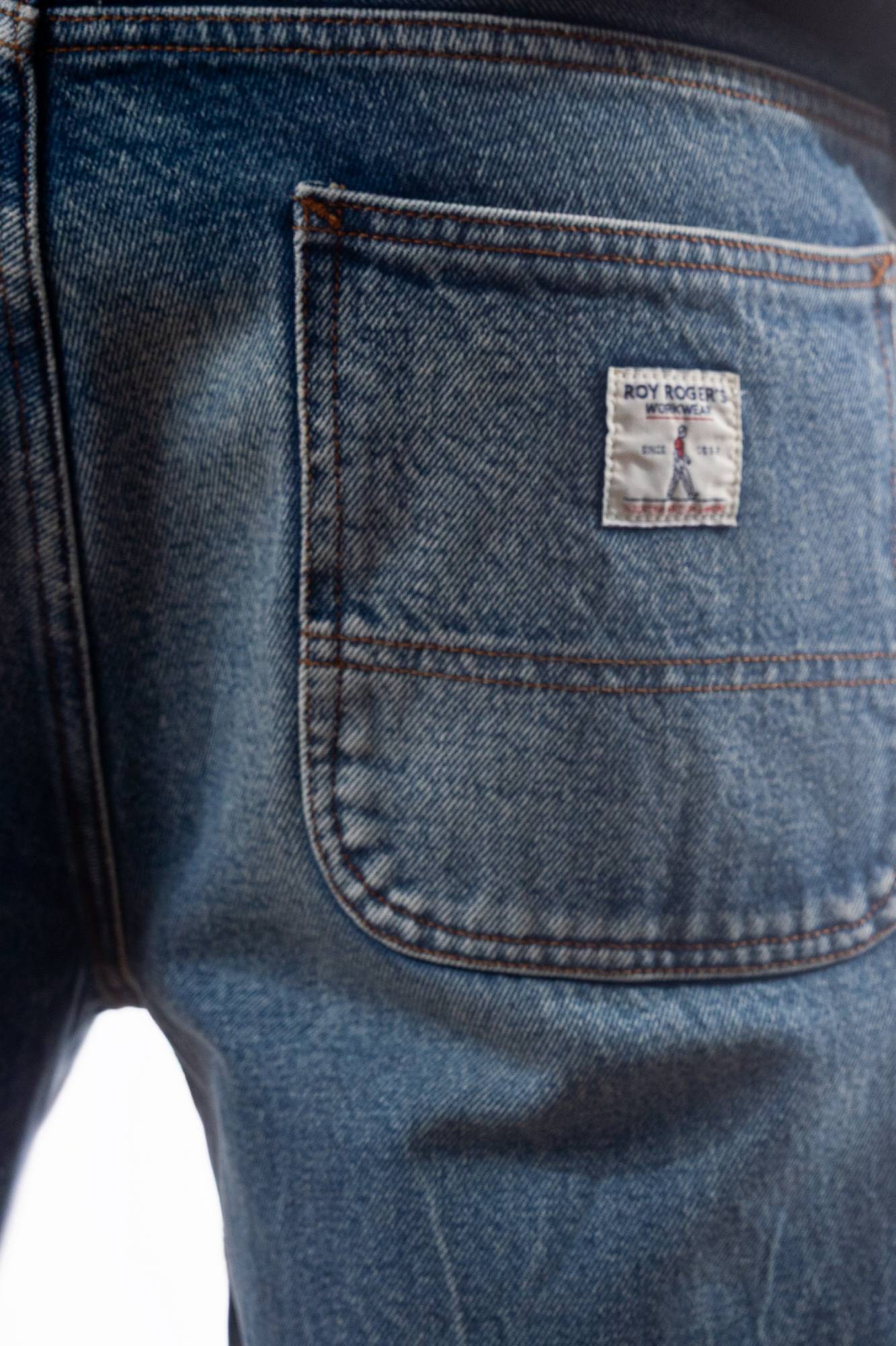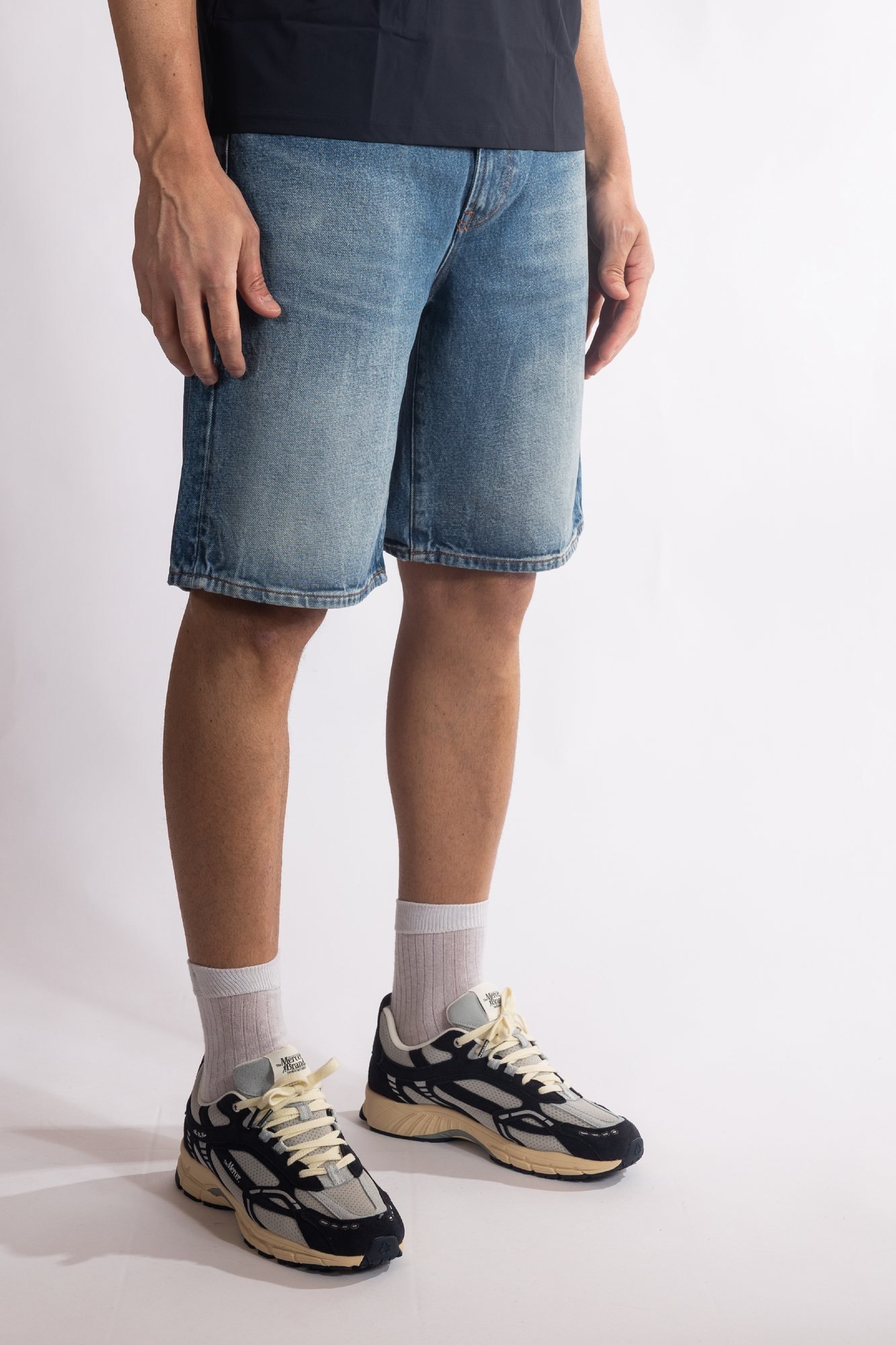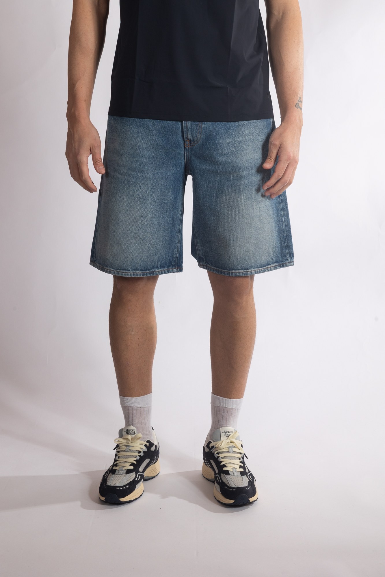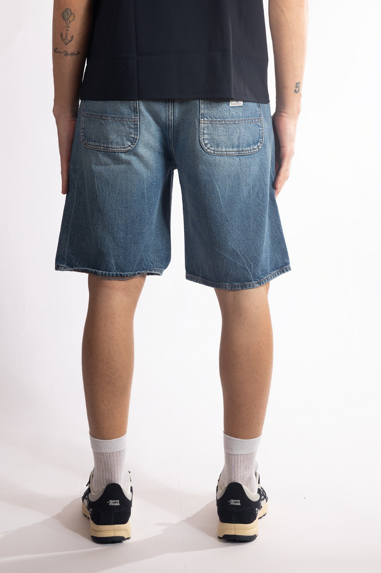 Bermuda in denim cargo con tasche laterali applicate a soffietto con patta, cuciture tono su tono e tasche posteriori arrotondate.