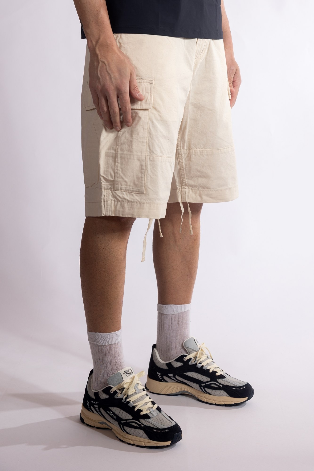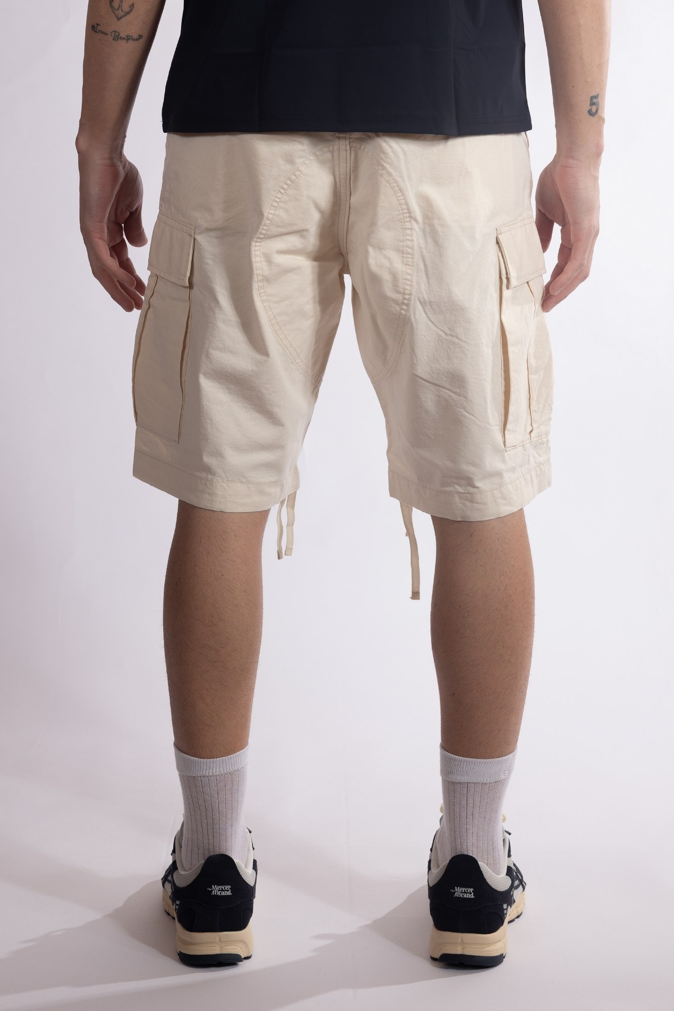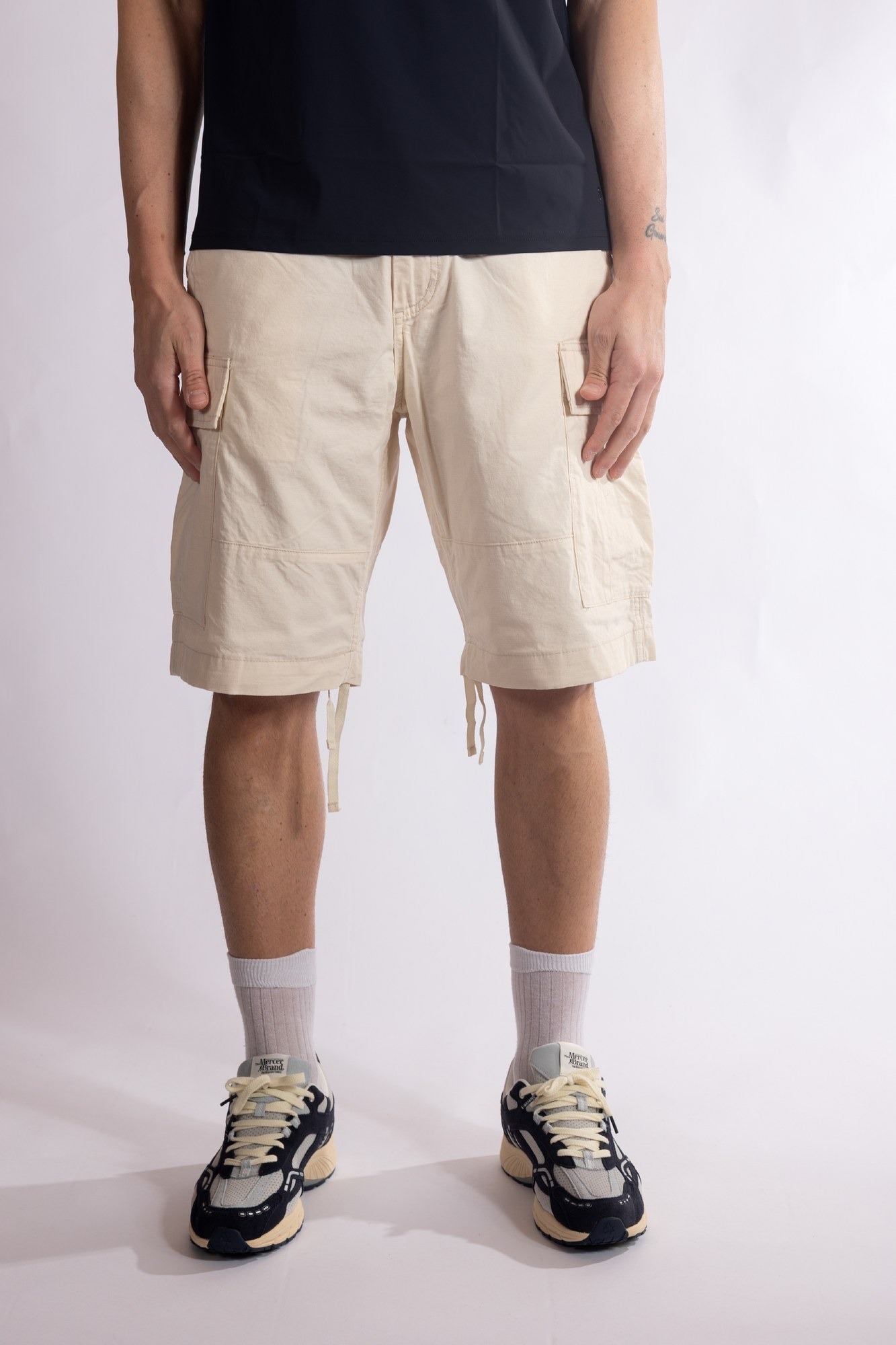 Bermuda cargo con tasche laterali a soffietto con patta, laccetti regolabili sul fondo gamba e cuciture tono su tono.