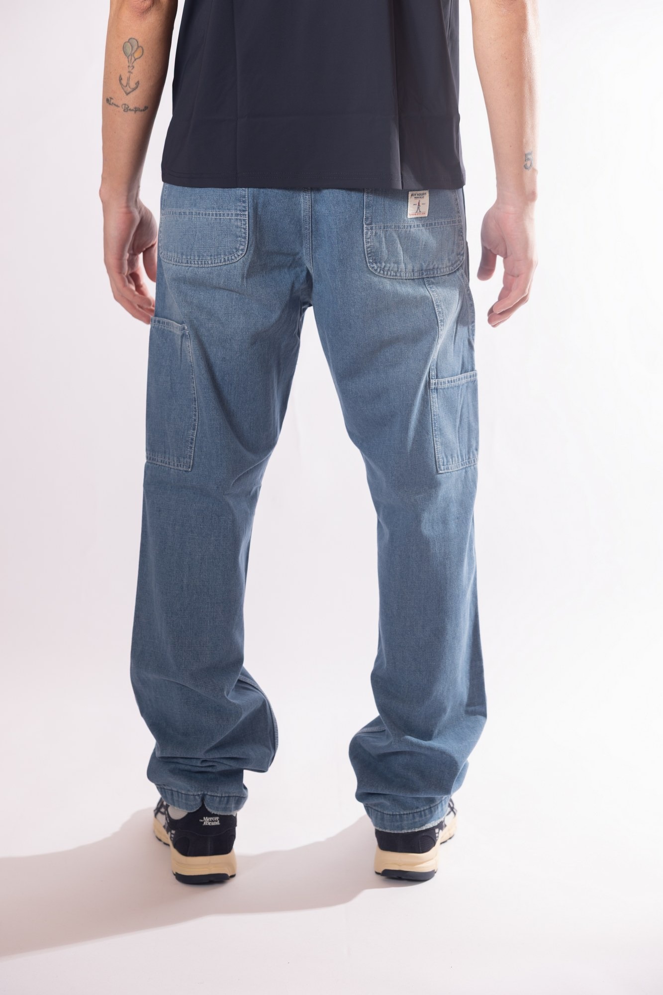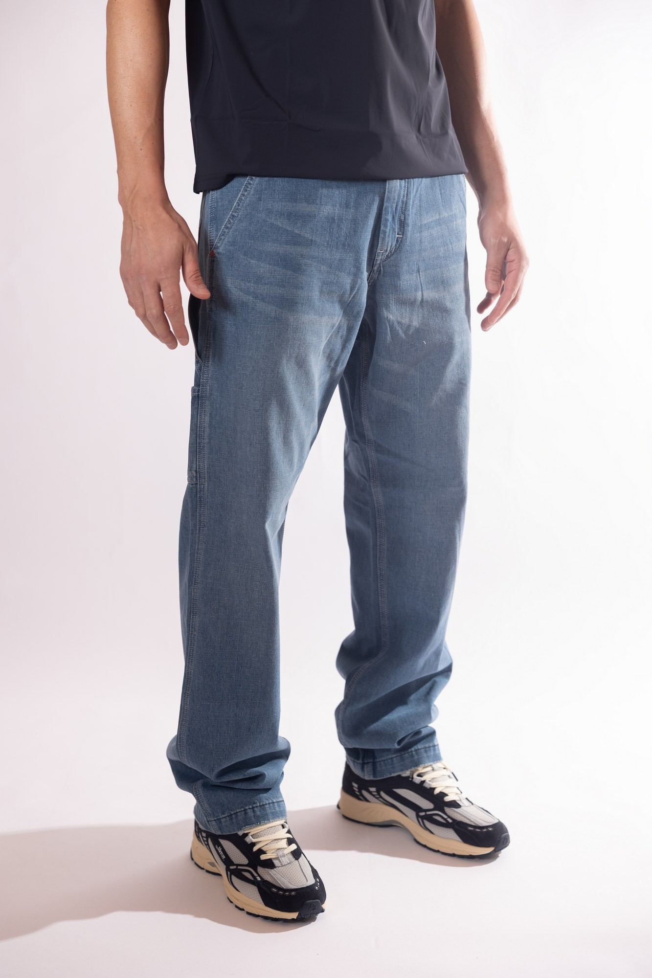 Jeans carpenter com ampie tasche applicate sul retro e i taschini laterali, cuciture tono su tono ed etichetta logata applicata sulla tasca posteriore.