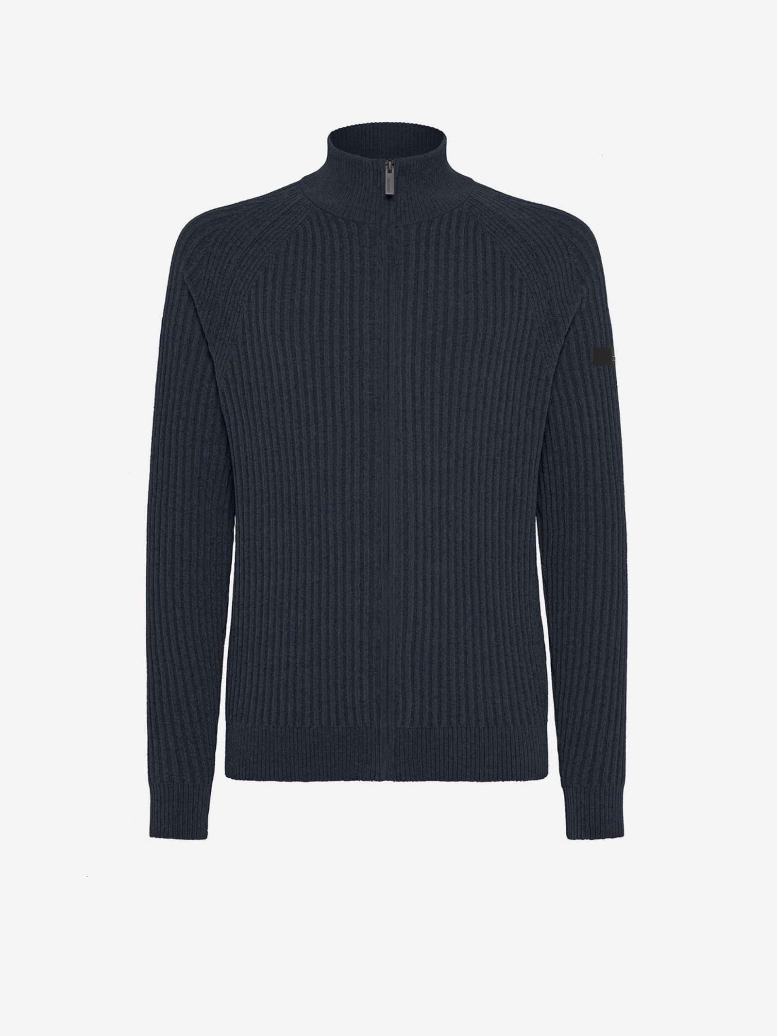 Cardigan con lavorazione ad ampie coste inglesi, zip integrale sul davanti, taglio raglan delle maniche, filetto arancio fluo sul bordo posteriore e logo a microiniezione sulla manica sinistra.