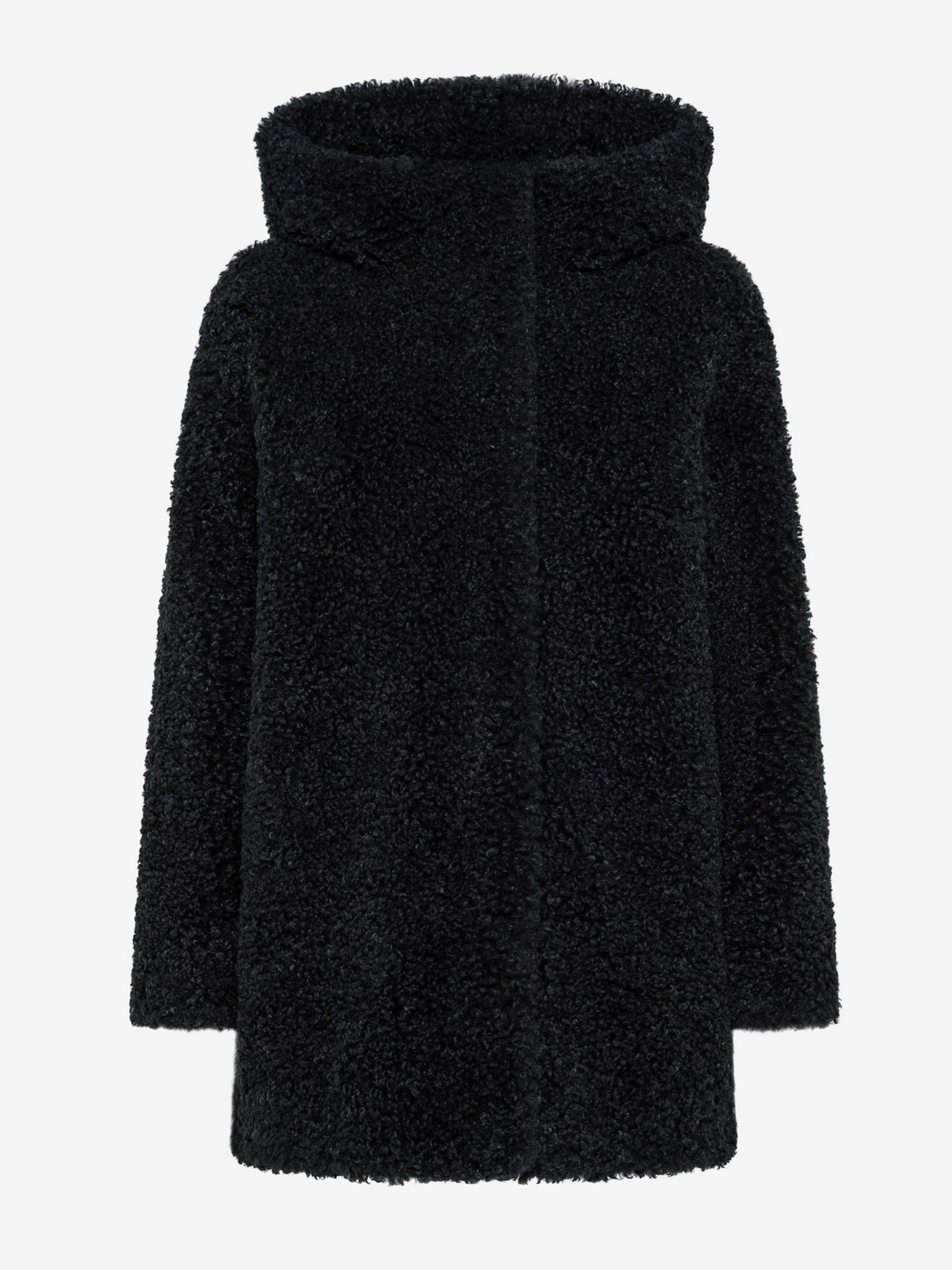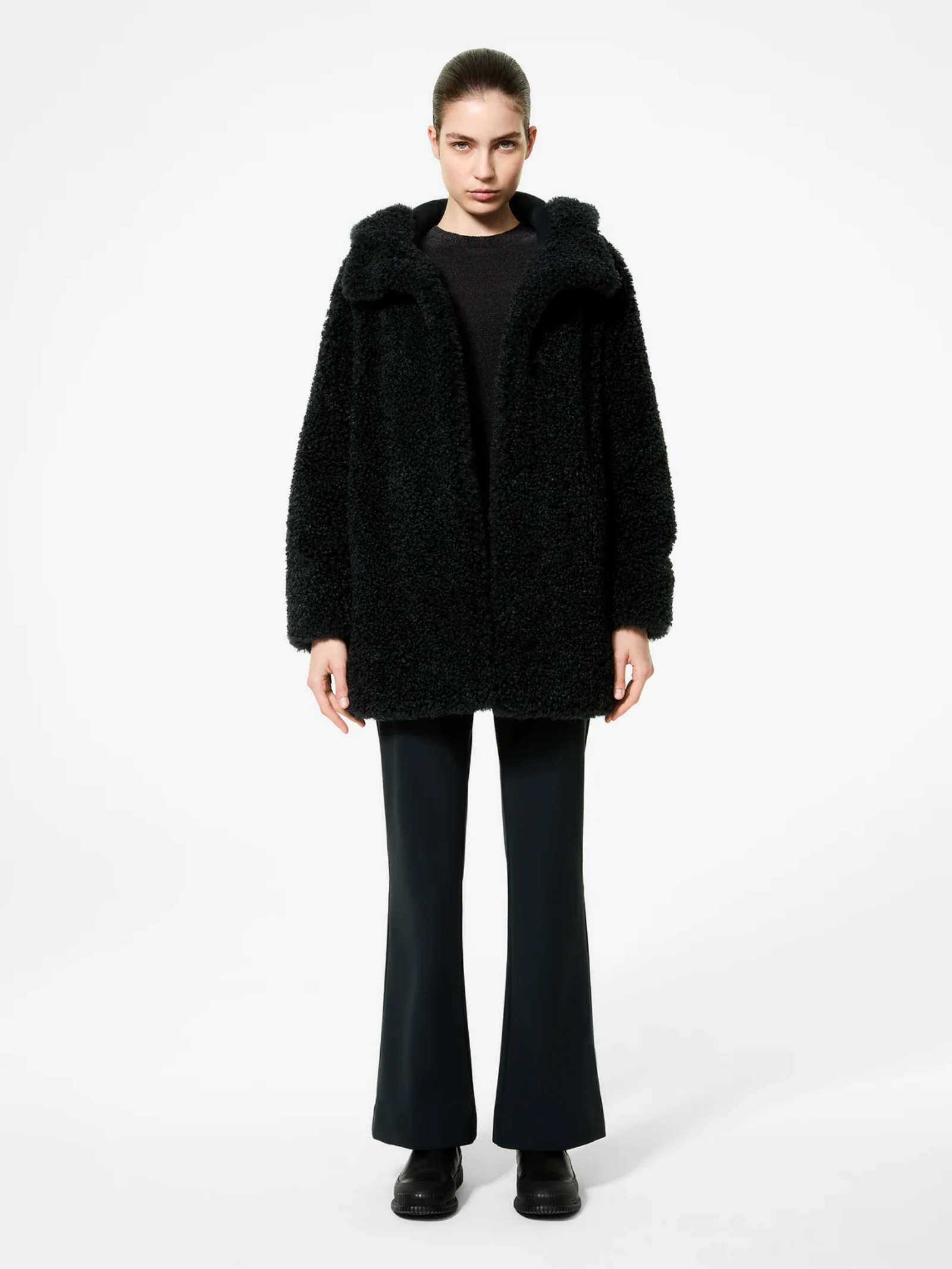 Eco pelliccia premium reversibile in eco suede ed ecopelliccia agnellino, cappuccio avvolgente, abbottonatura nascosta, bordi in lamb e logo a microiniezione sulla manica sinistra.