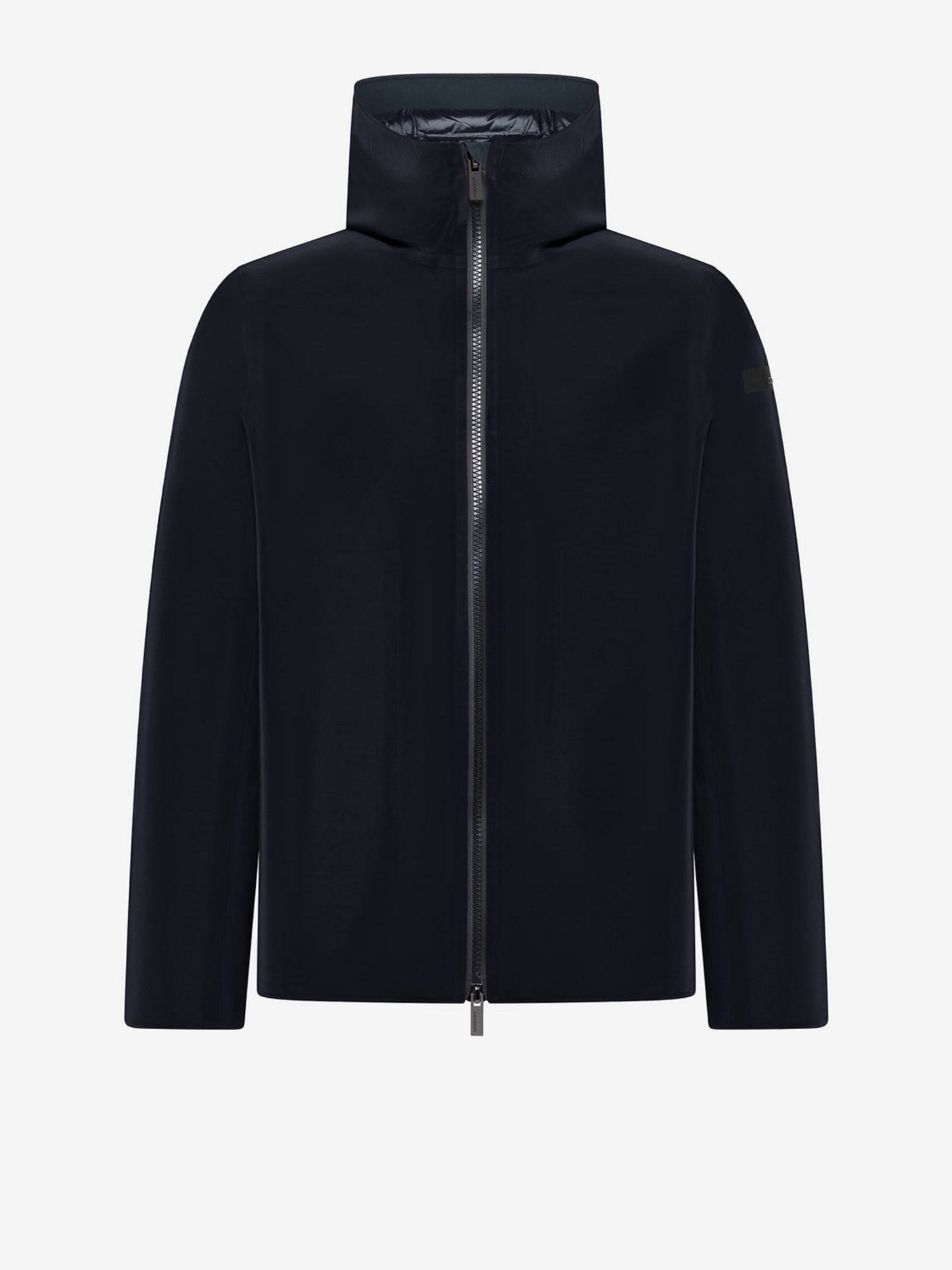 Giacca in membrana Stratofabric#3 spalmato a silicone con zip spalmata a doppio cursore, colletto e cappuccio fisso, tasche laterali a zip termonastrate, doppio filetto sulla zip invisibile del taschino e logo a microiniezione sulla manica.