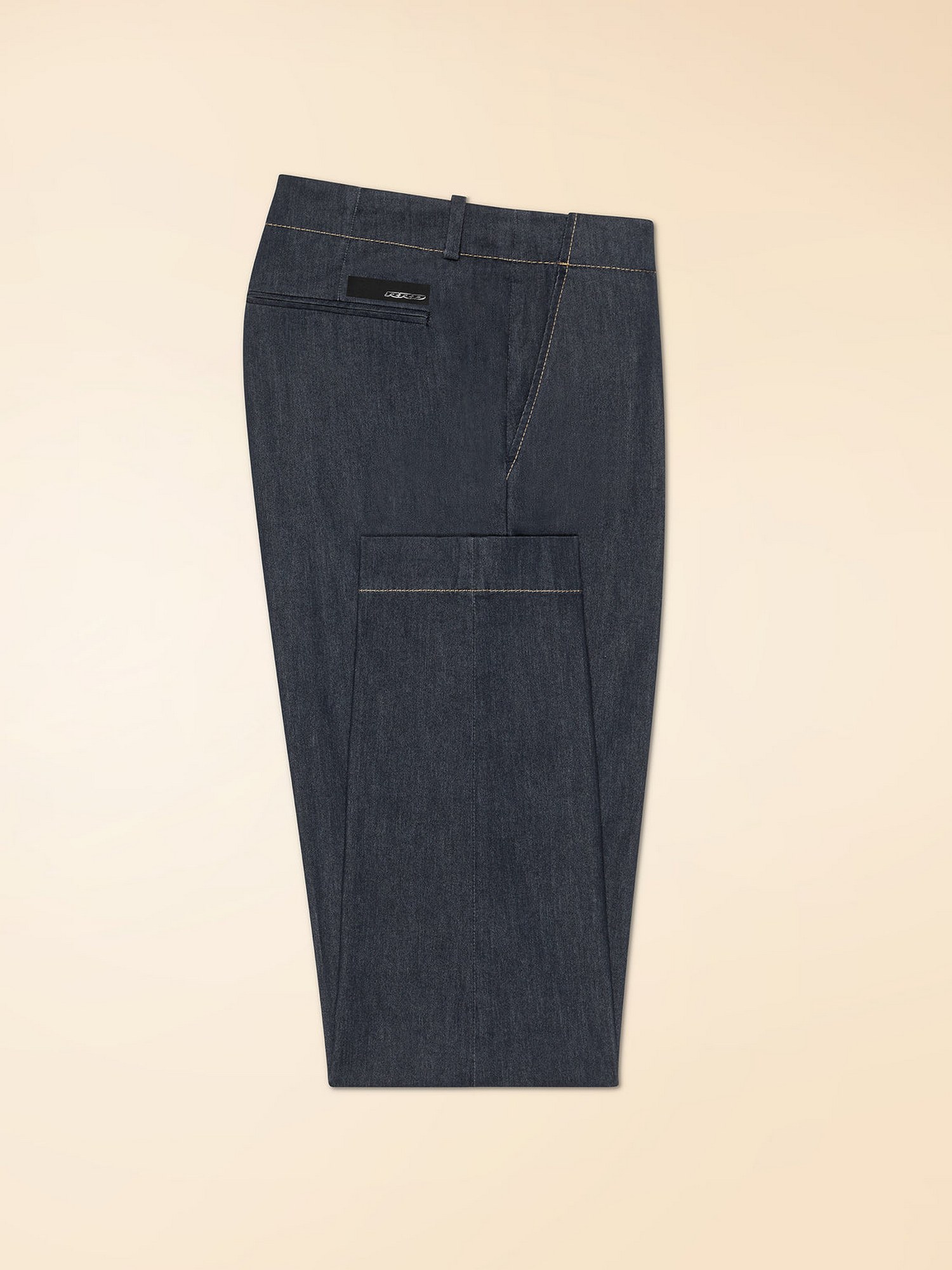 Pantaloni in denim tecnico elasticizzato con abbottonatura in corno celata dalla pattina, cuciture a vista e tasche laterali alla francese.