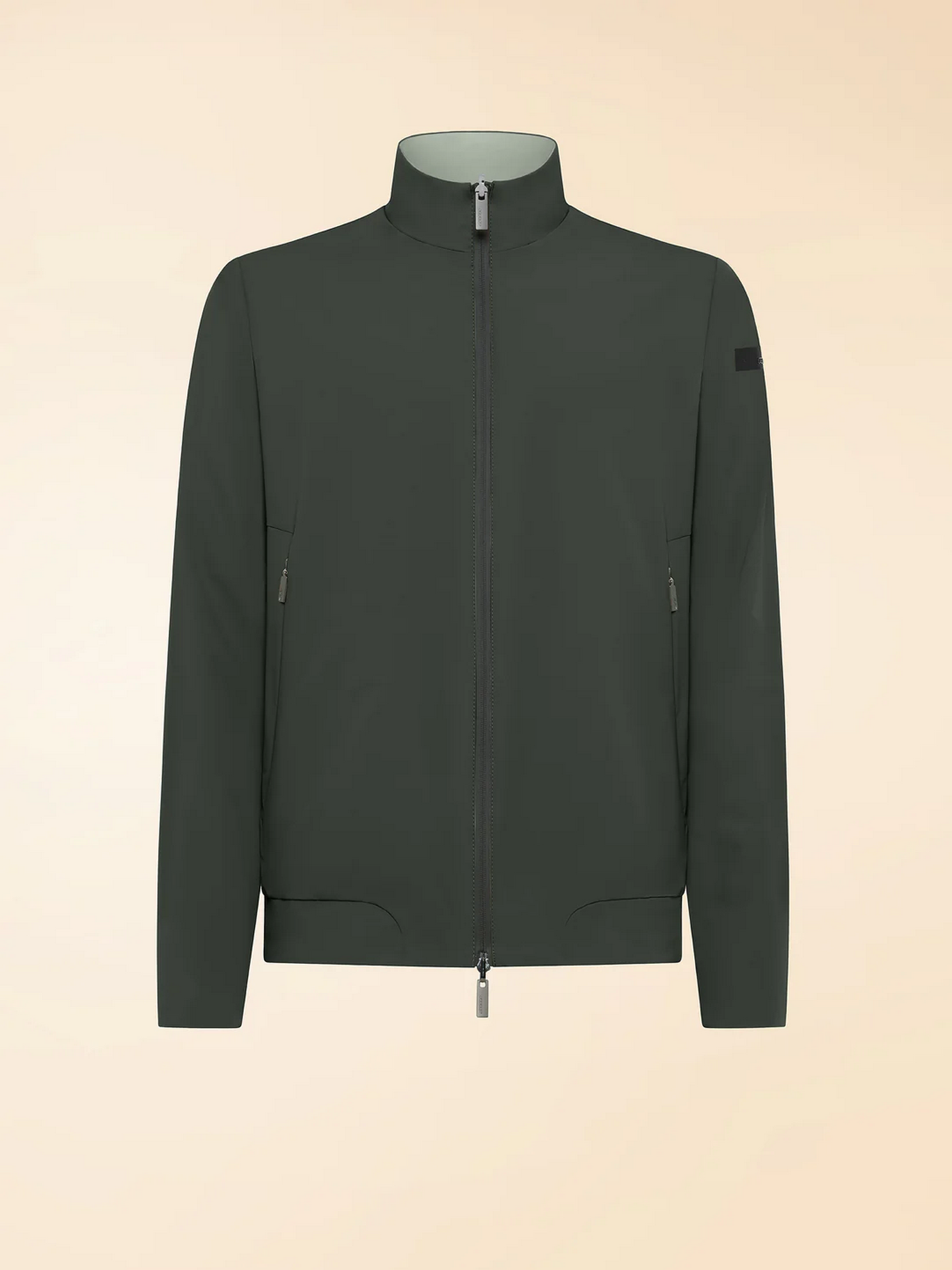 Bomber reversibile in tessuto stretch con zip gommata a doppio cursore, tasche laterali con zip invisibili, nastratura sul fondo posteriore e logo a microiniezione sulla manica sinistra.