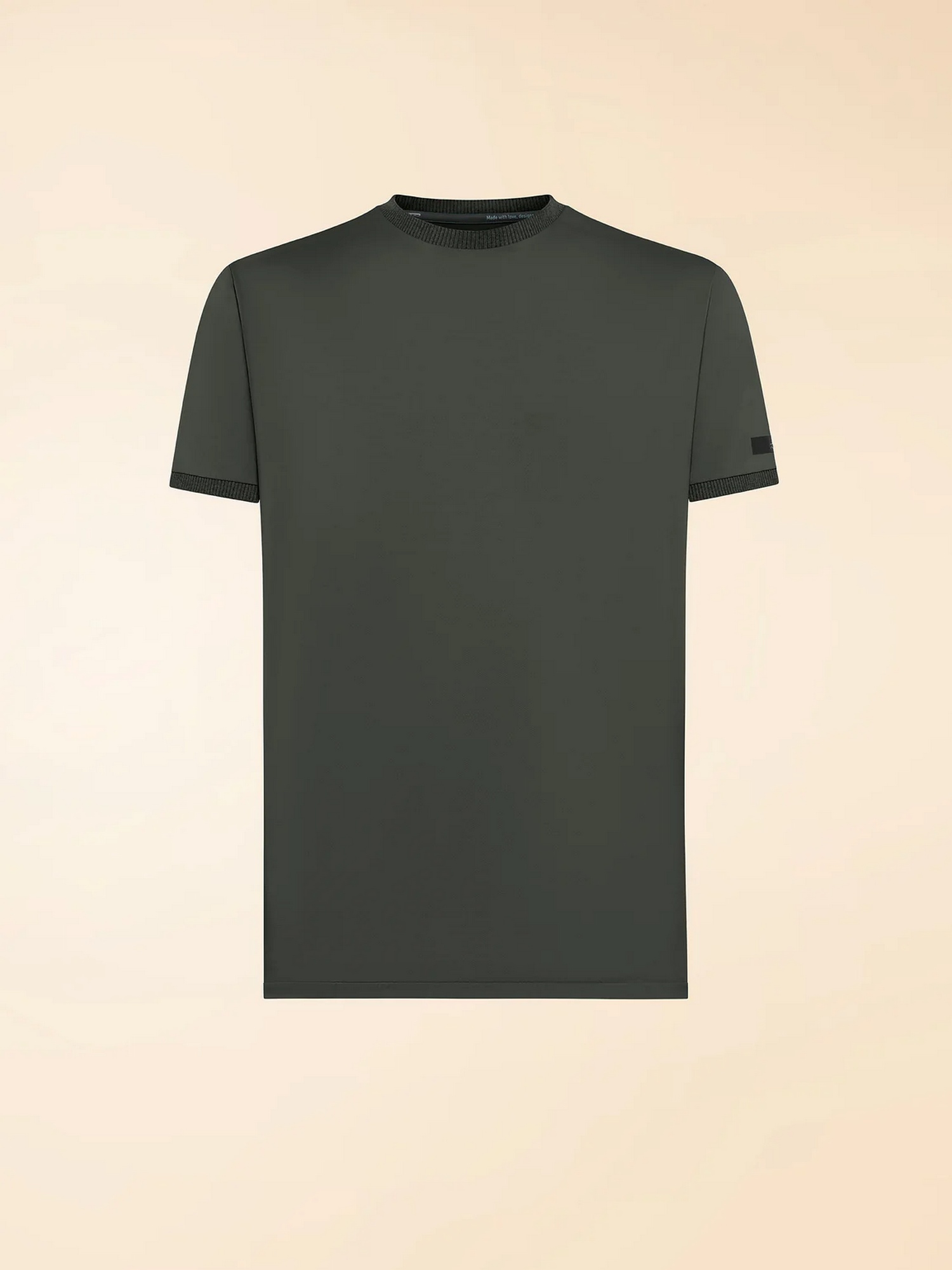 T-shirt con lavorazione a costine elasticizzate del colletto e delle maniche corte.