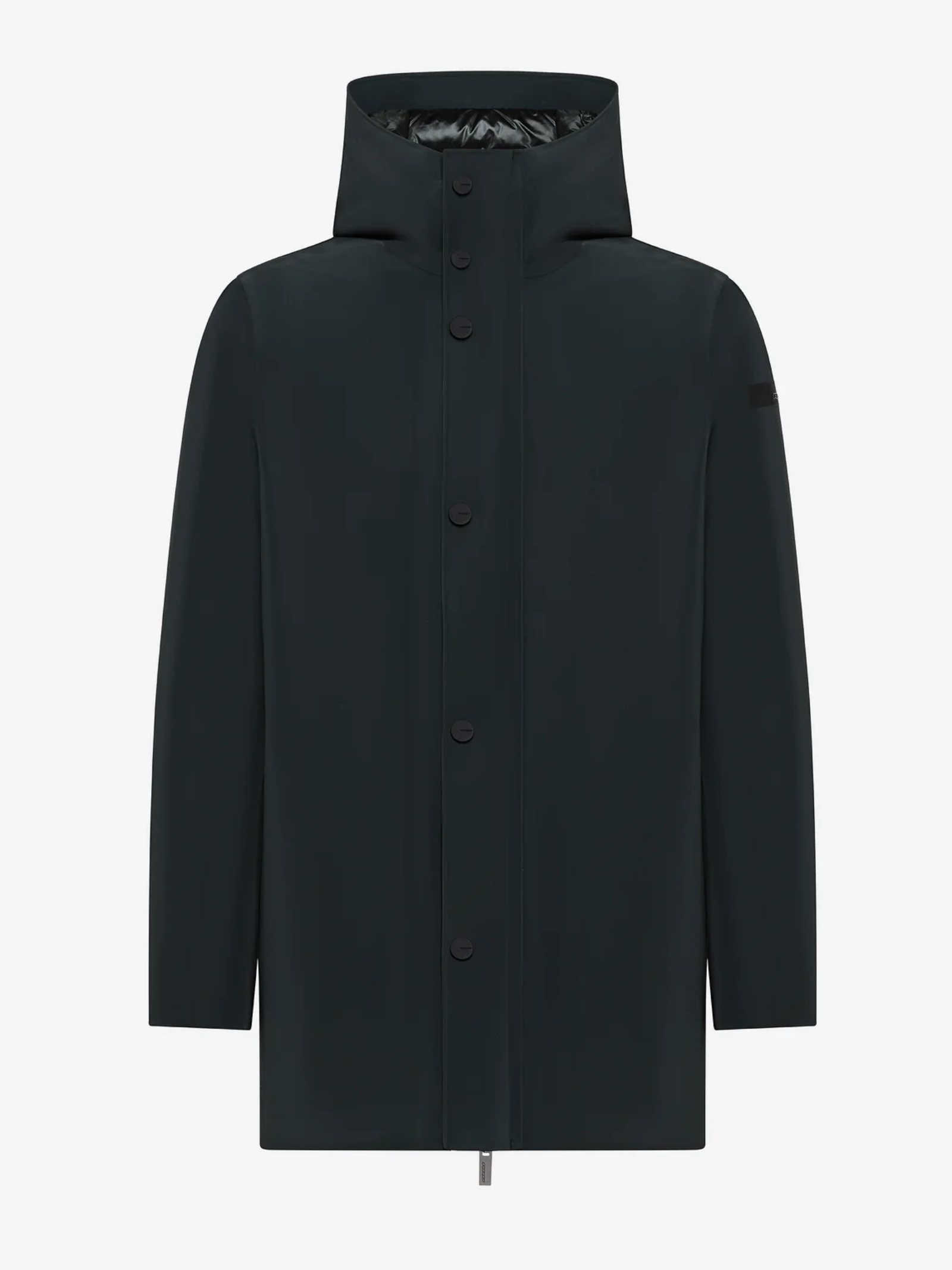 Parka in tessuto a membrana Stratofabric#3 con spalmatura a silicone, patta a bottoni a pressione gommati che nasconde la zip metallica a doppio cursore, cappuccio avvolgente imbottito, interno provvisto dal taschino chiuso dalla zip invisibile e ravvivato dal doppio filetto arancione fluo e logo a microiniezione sulla manica sinistra.