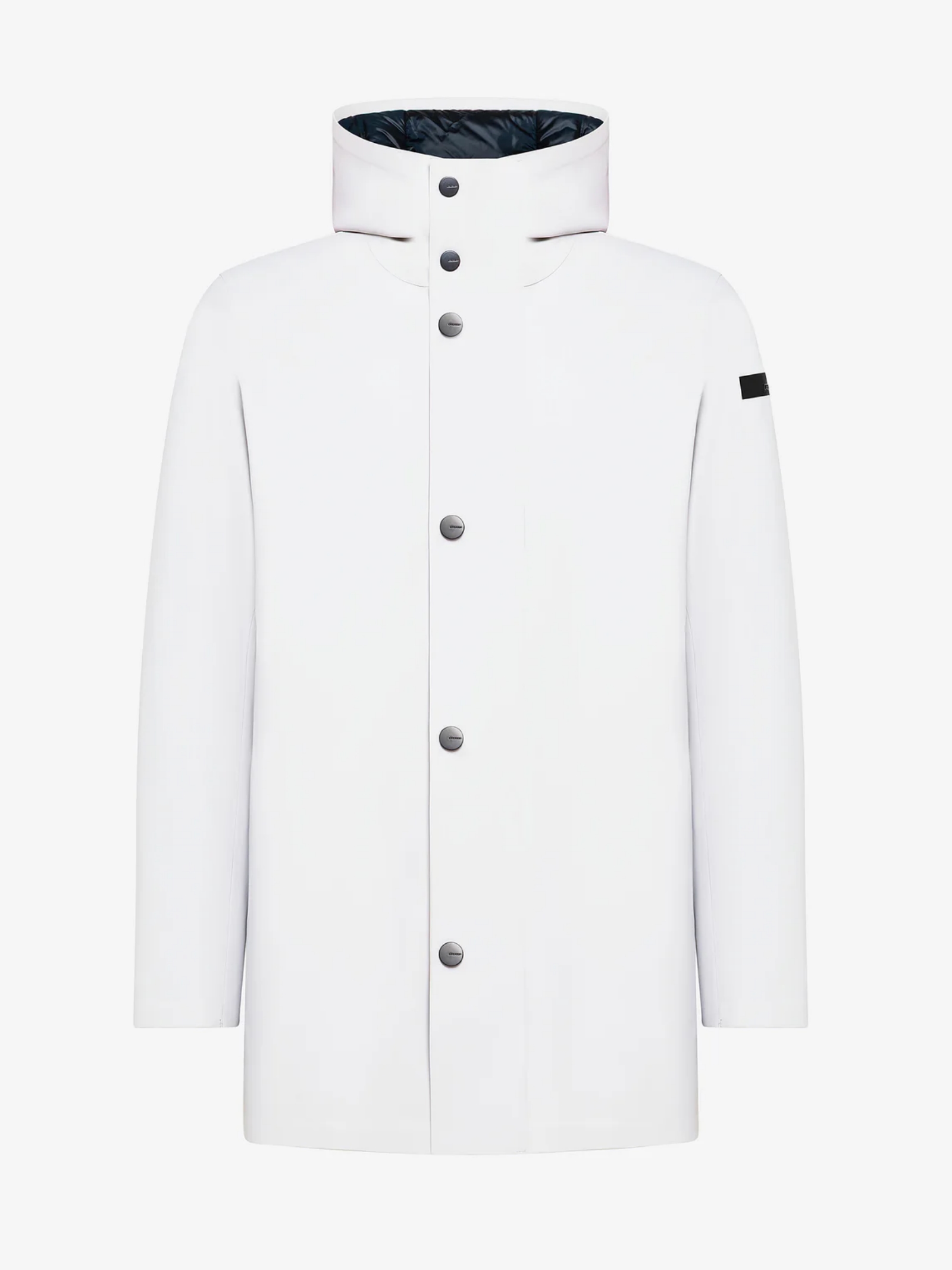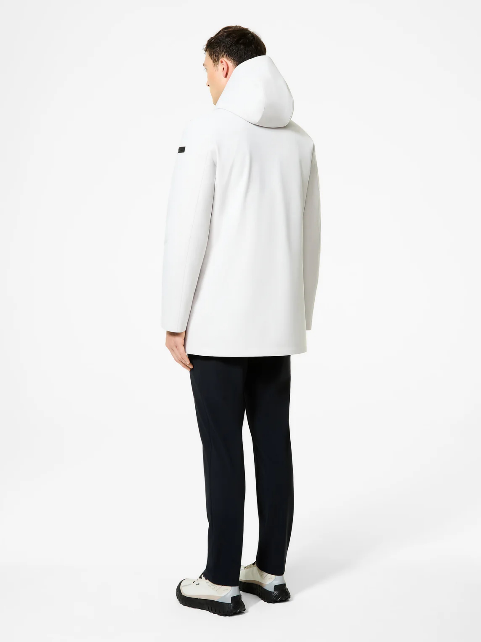 Parka totalmente privo di impunture in membrana Stratofabric #3, bottoni metallici a pressione, zip integrale a doppio cursore metallico, affiancata dalle ampie tasche laterali a pistagna. L'interno presenta il taschino chiuso dalla zip invisibile con doppio filetto arancione fluo e logo a microiniezione nero sulla manica sinistra conferisce una nota di stile inconfondibile al design.