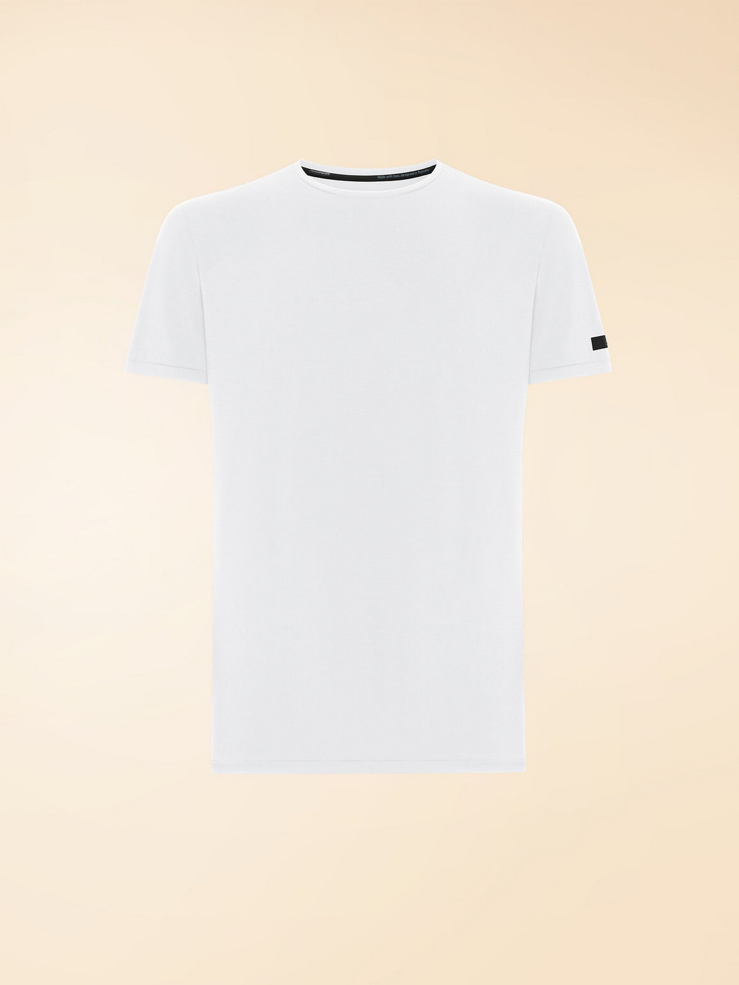 T-shirt in tessuto elasticizzato con lavorazione a rilievo a effetto seersucker square e micro spacchi laterali.