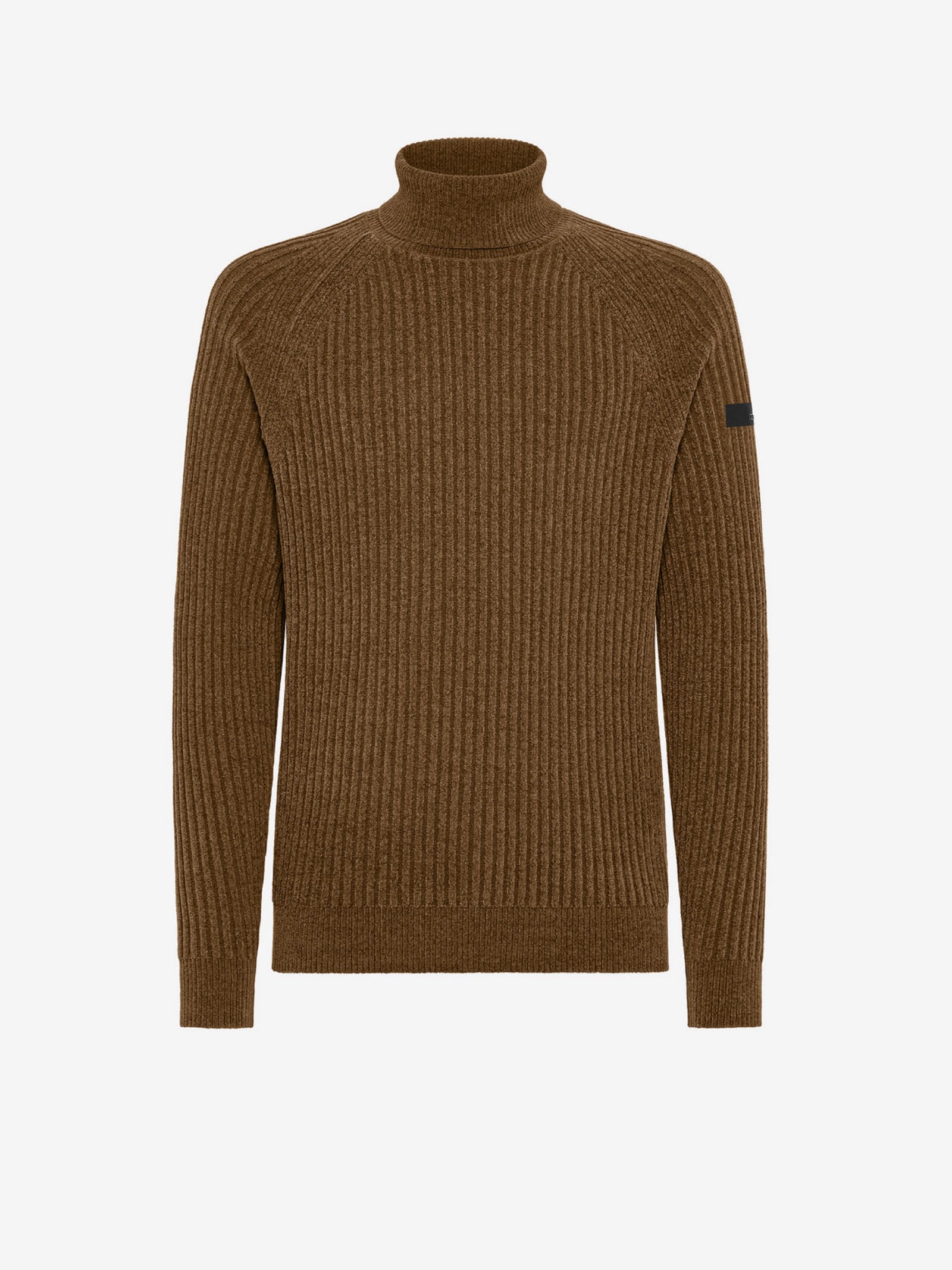 Dolcevita in tessuto stretch lavorato ad ampie coste inglesi con taglio raglan, collo alto, polsi e fondo rifiniti con sottili coste elasticizzate e logo a microiniezione sulla manica sinistra.
