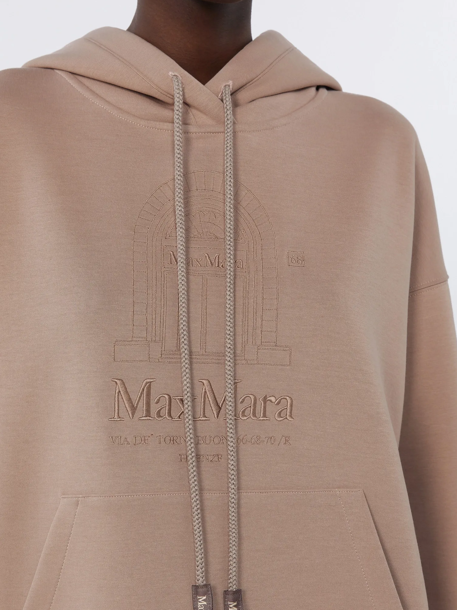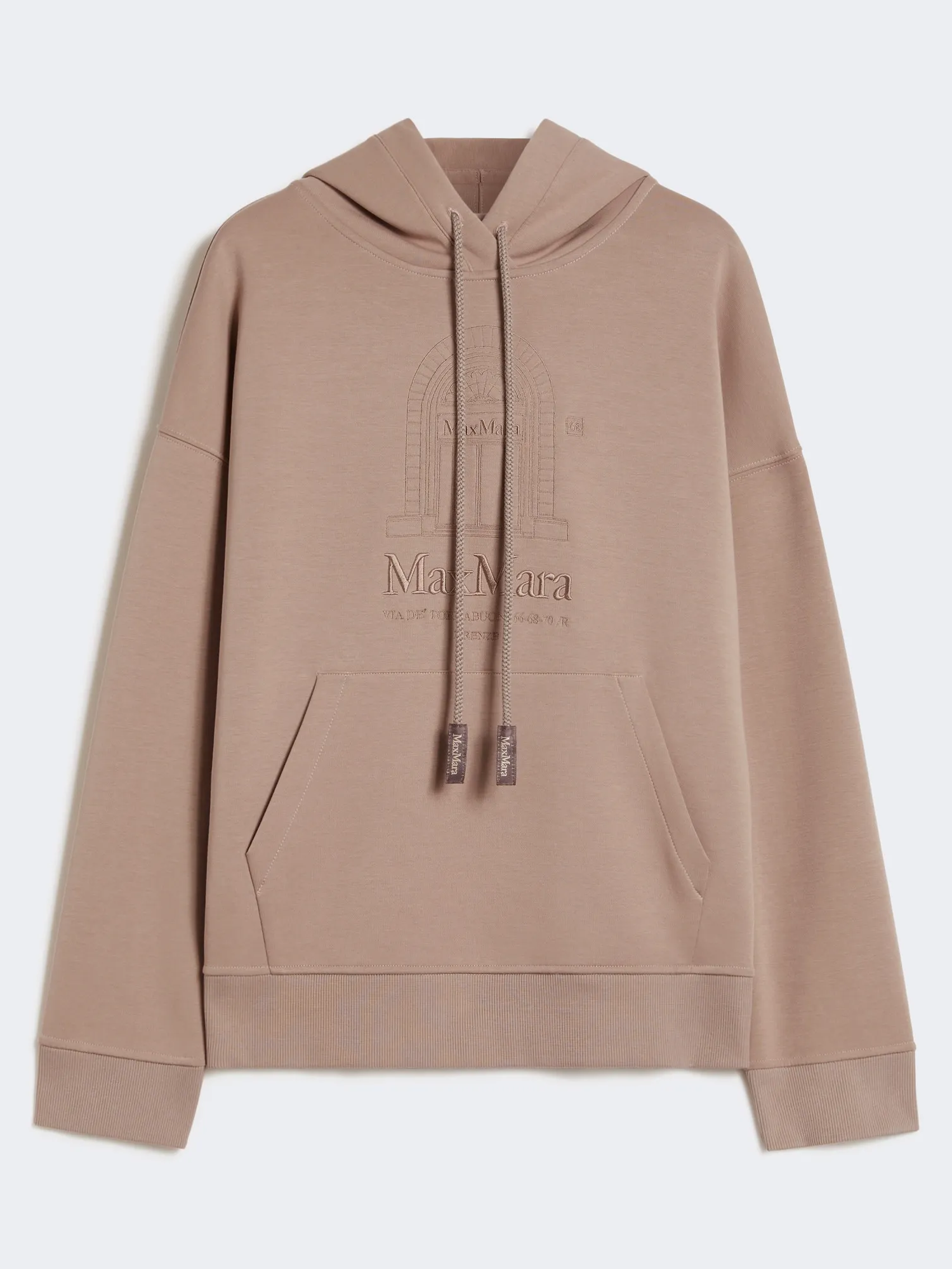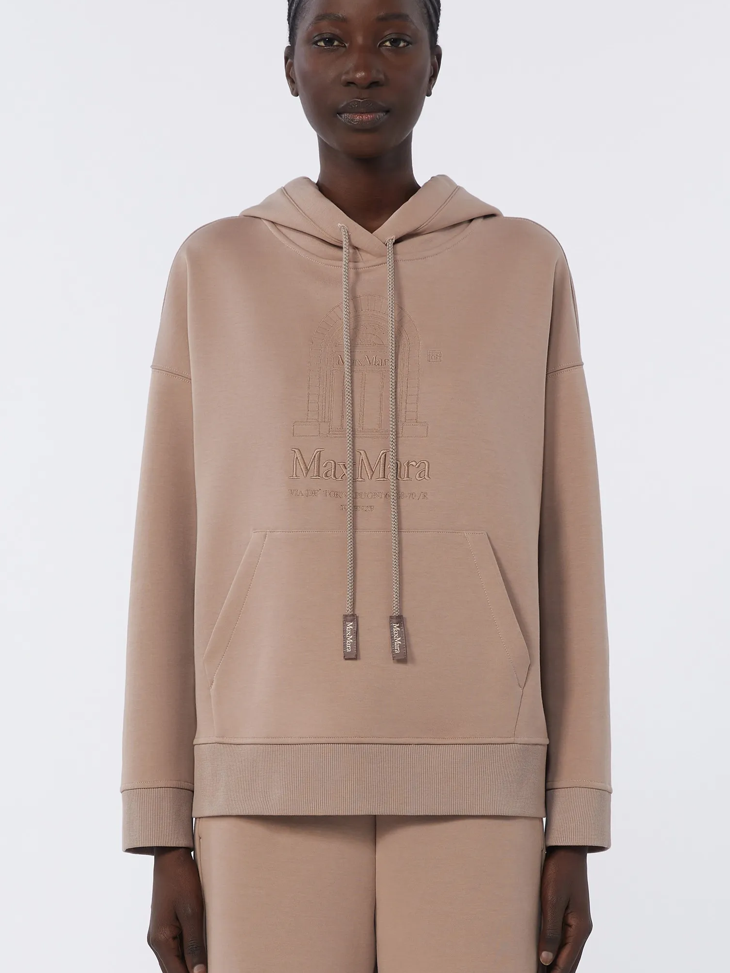 Felpa in jersey di cotone tecnico con cappuccio a coulisse, grafica ricamato sul davanti, tasca marsupio sul davanti, polsi e bordo a costine.