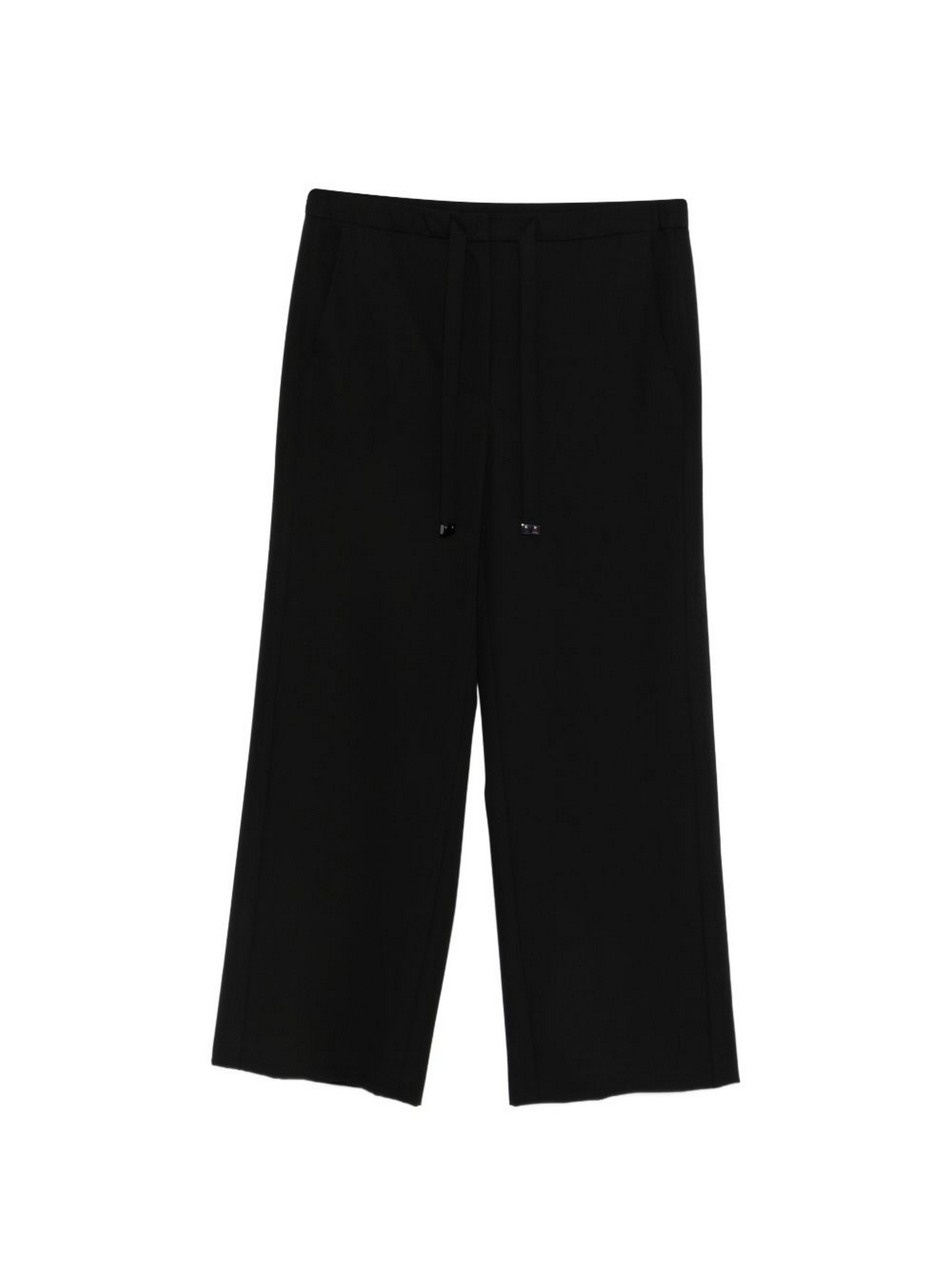 Pantalone jogging in gabardina di pura lana crêpe con coulisse, taglio cropped alla caviglia, vita elasticizzata regolabile con nastro tecnico e tasche alla francese sui fianchi.