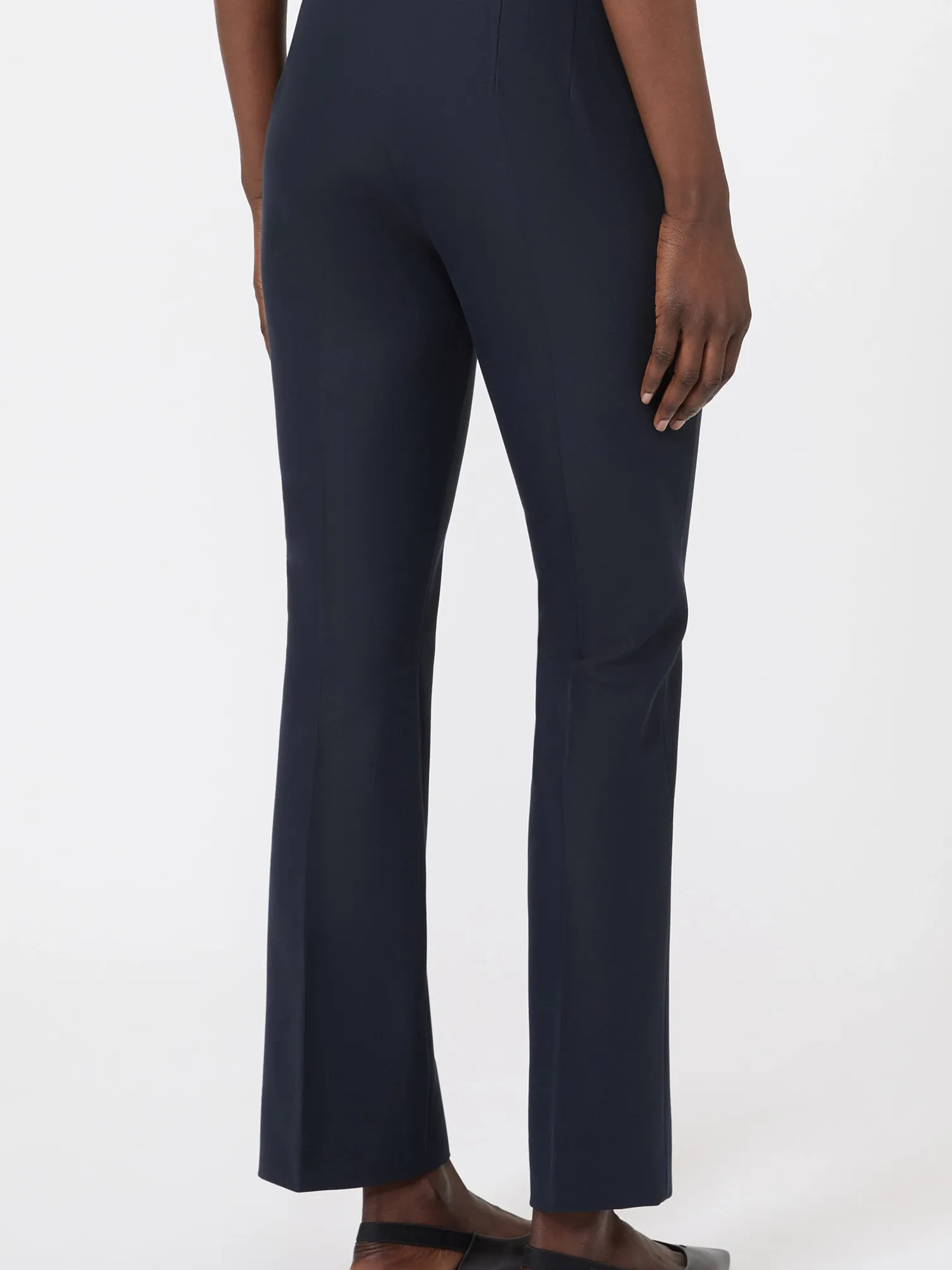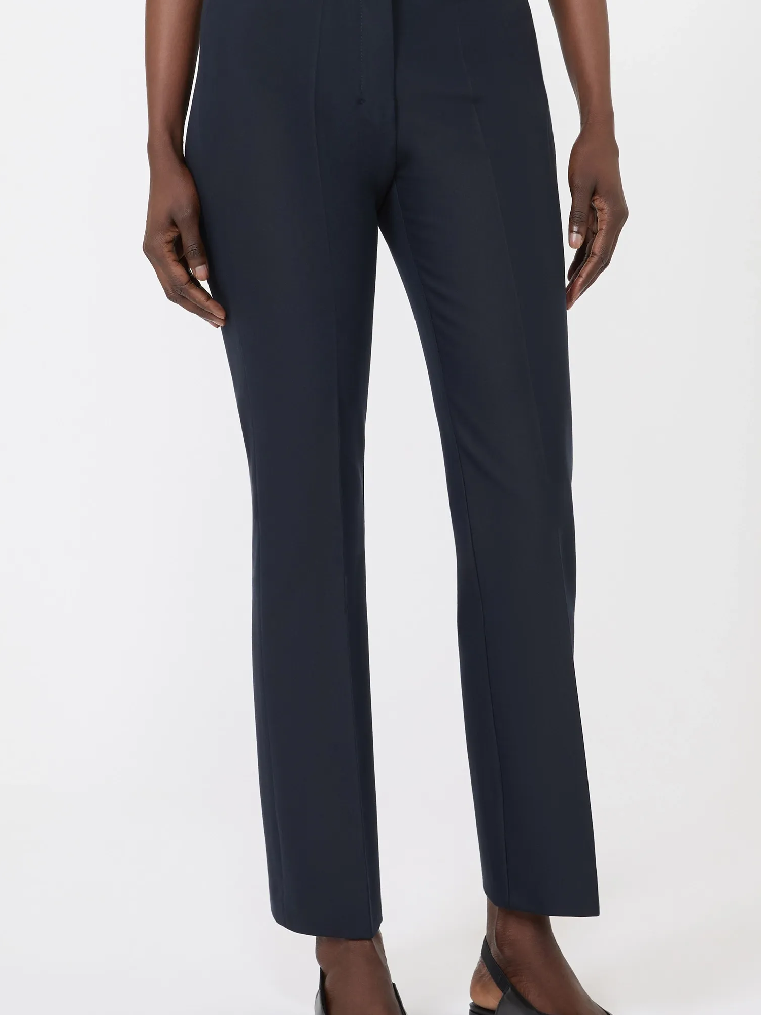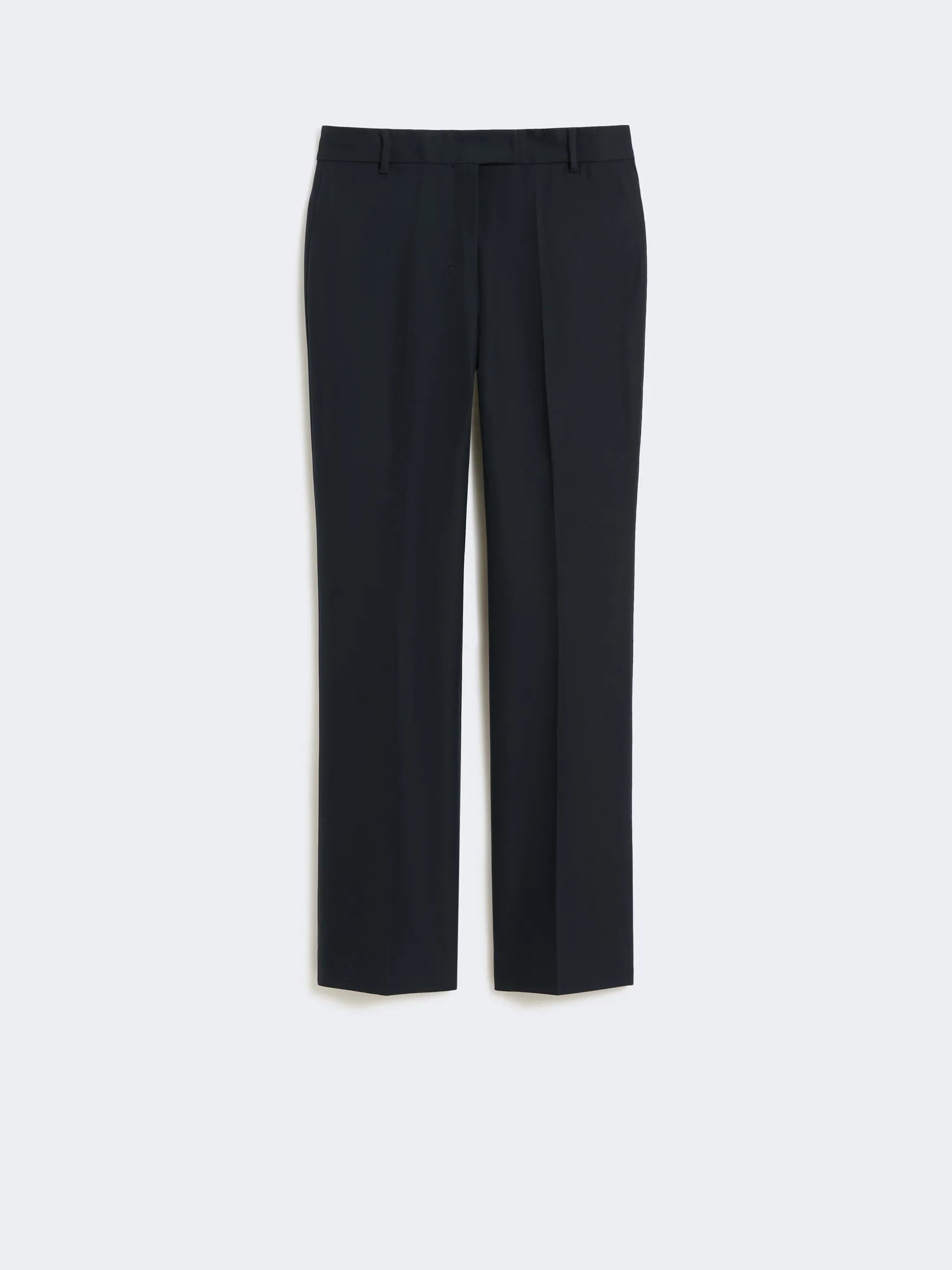 Pantalone slim fit svasatao al fondo con chiusura con listino alto in vita zip con patta e gancetto, passanti per cintura e piega stirata e pinces cucite in vita sul retro.