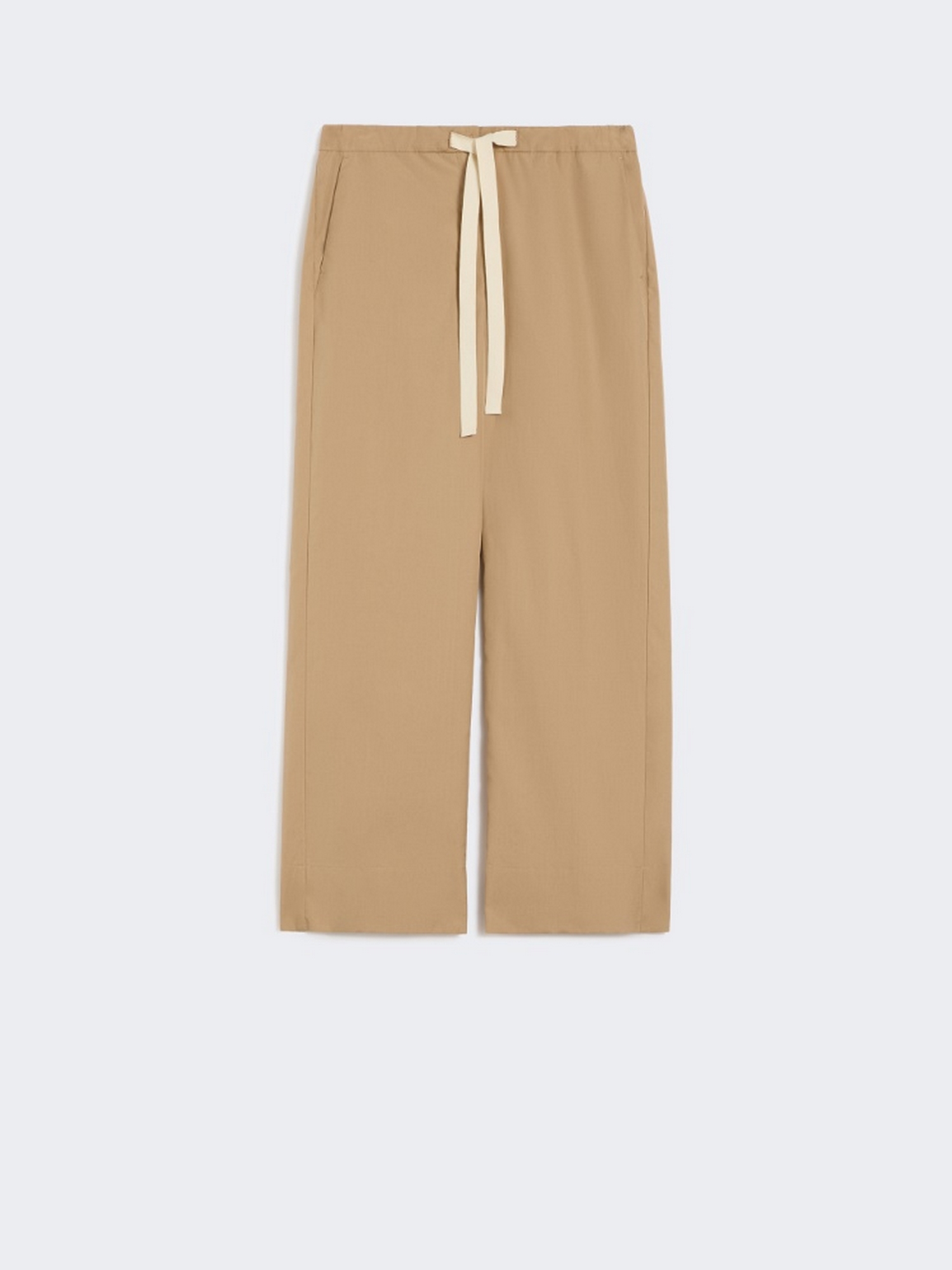 Pantalone straight leg in popeline di puro cotone con vita elasticizzata e coulisse, chiusura con zip coperta e gancetto e tasche alla francese sui fianchi.