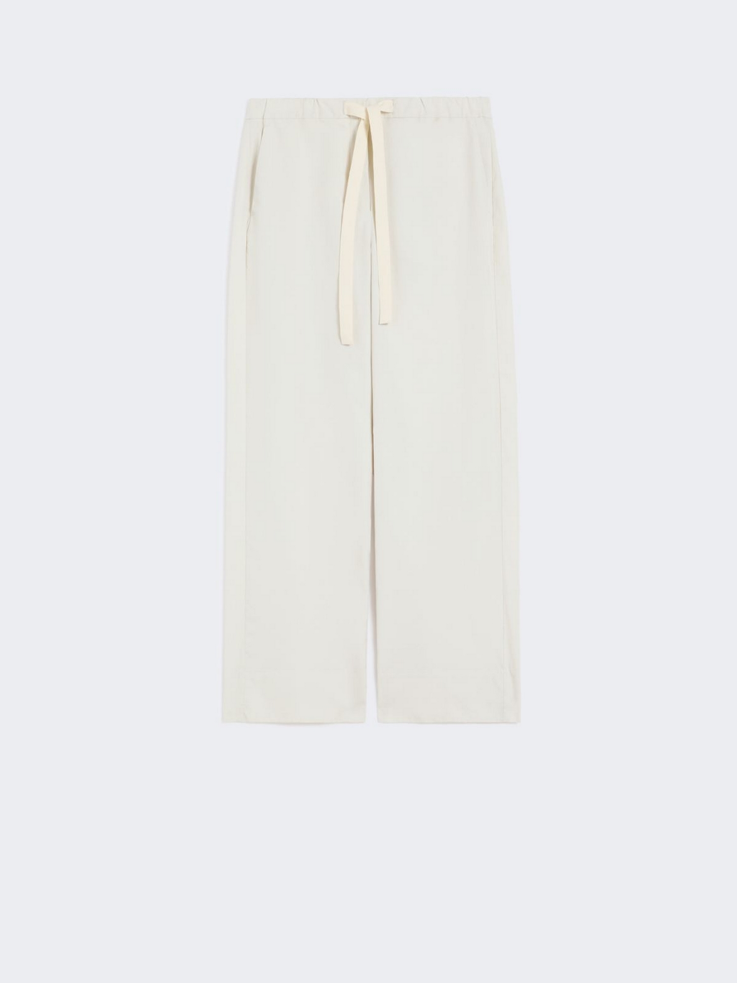 Pantalone straight leg in popeline di puro cotone con vita elasticizzata e coulisse, chiusura con zip coperta e gancetto e tasche alla francese sui fianchi.