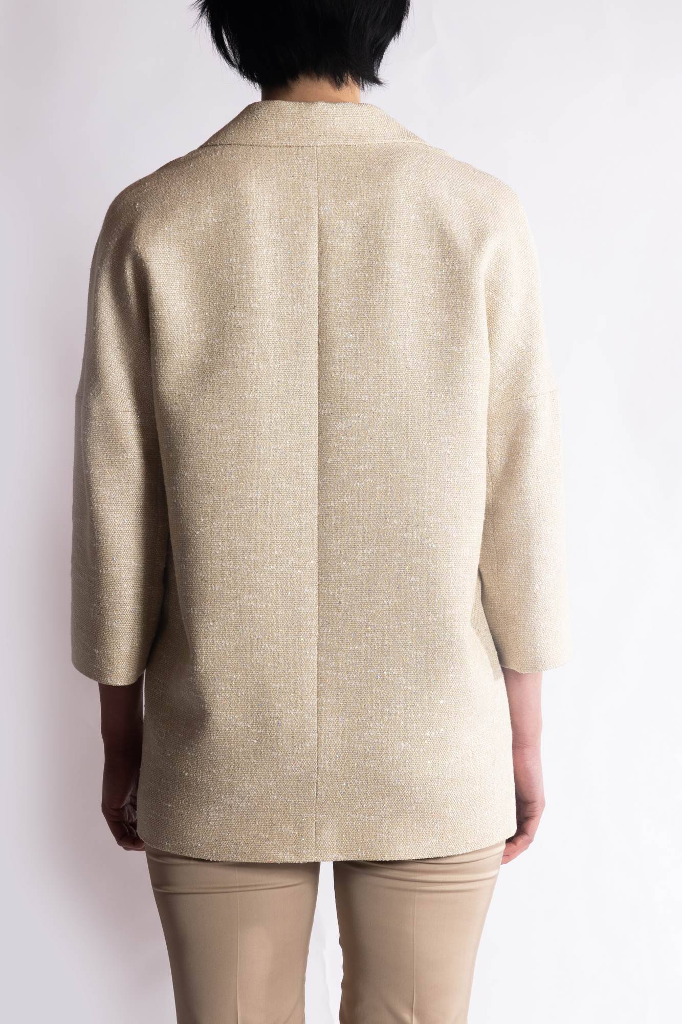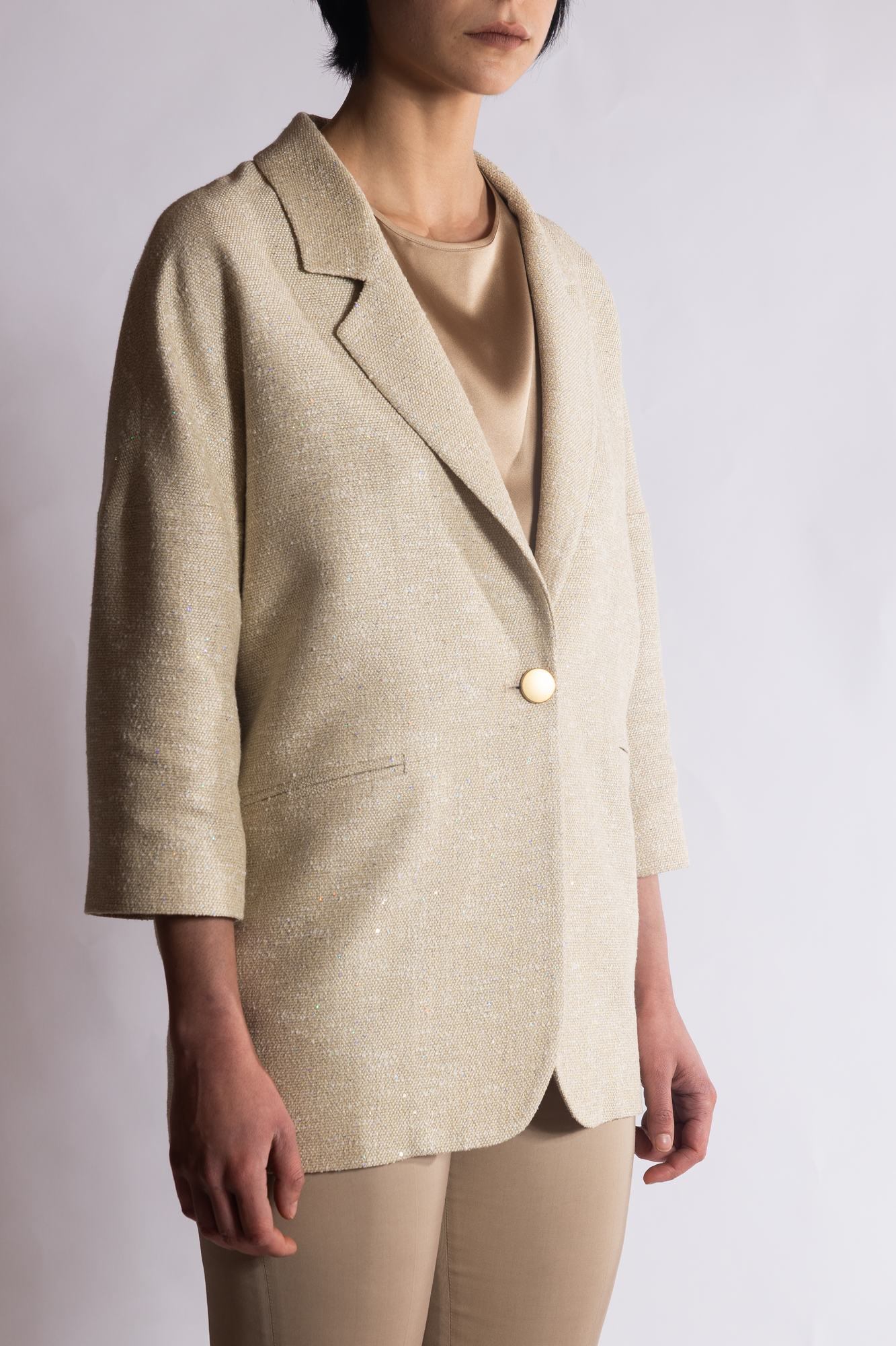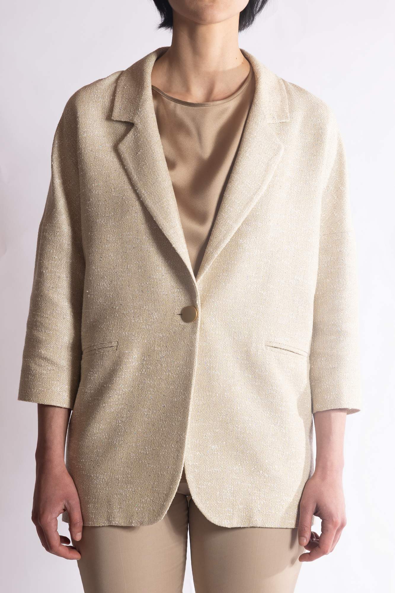 Blazer monopetto con trama materica, vestibilità leggermente over, rever a lancia e chiusura centrale con singolo bottone.