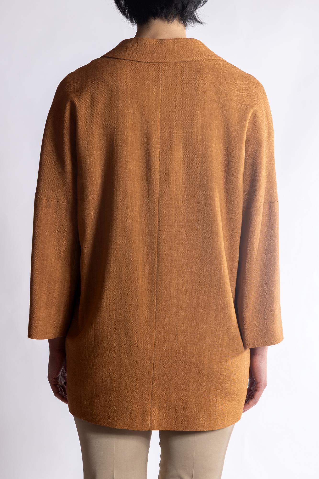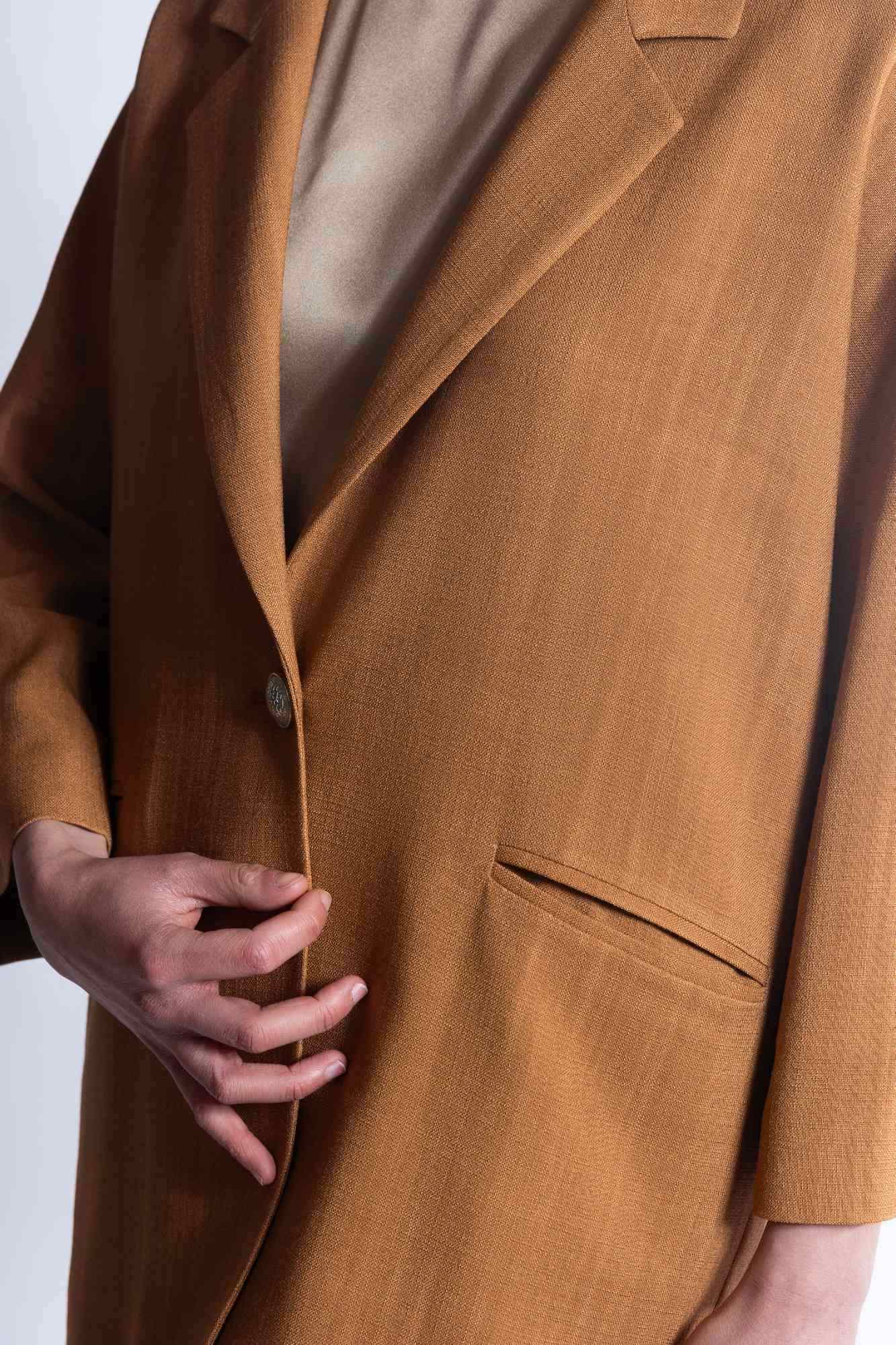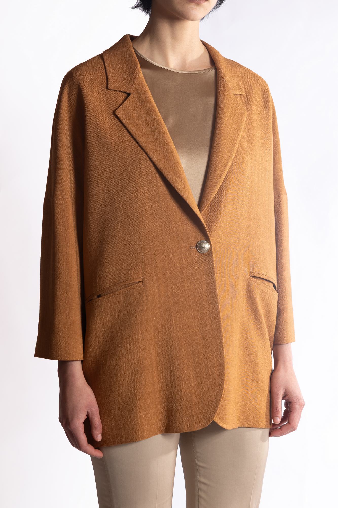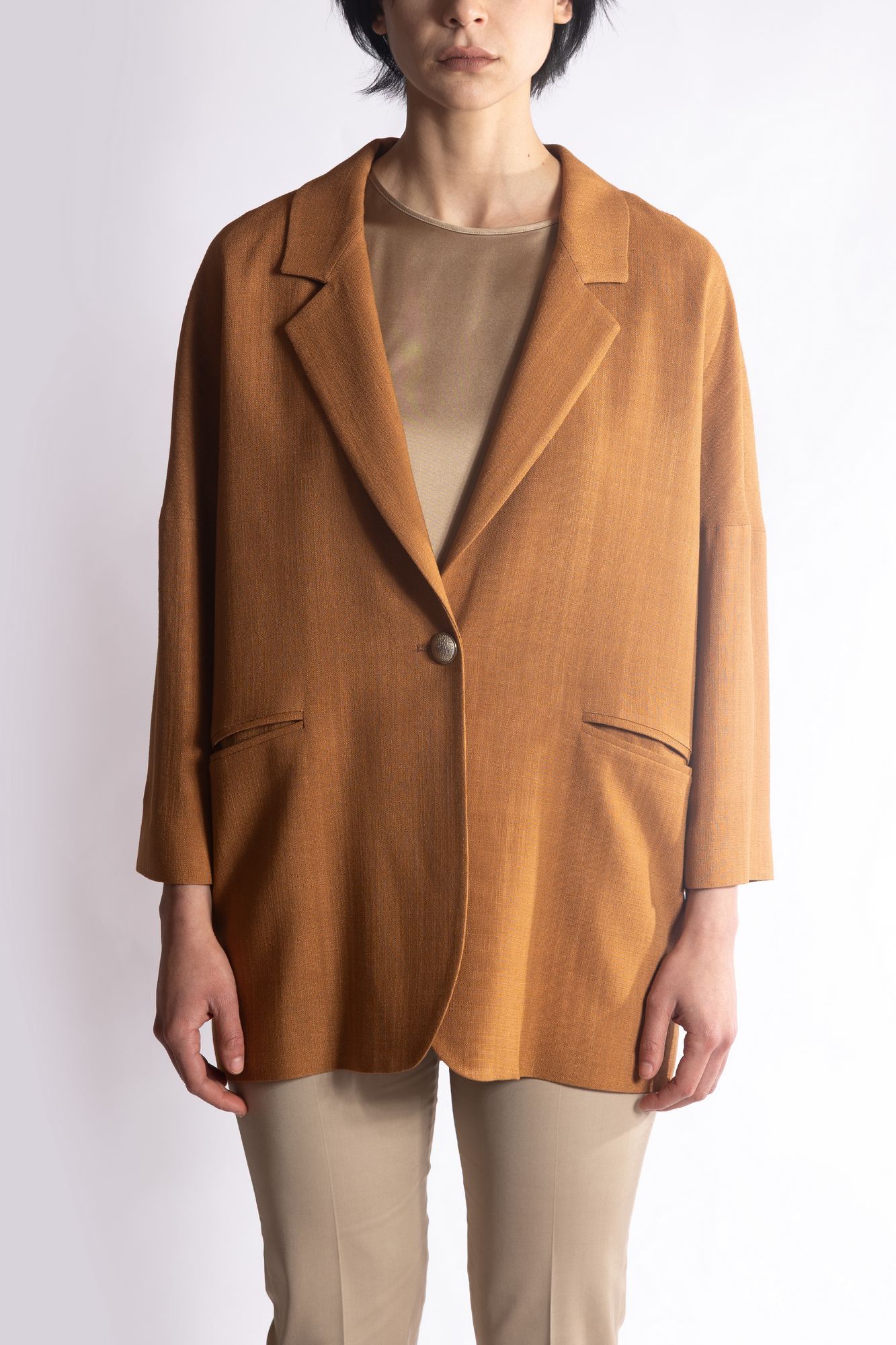 Blazer monopetto con trama materica, vestibilità leggermente over con spalle scese, revers a lancia e chiusura centrale con singolo bottone.