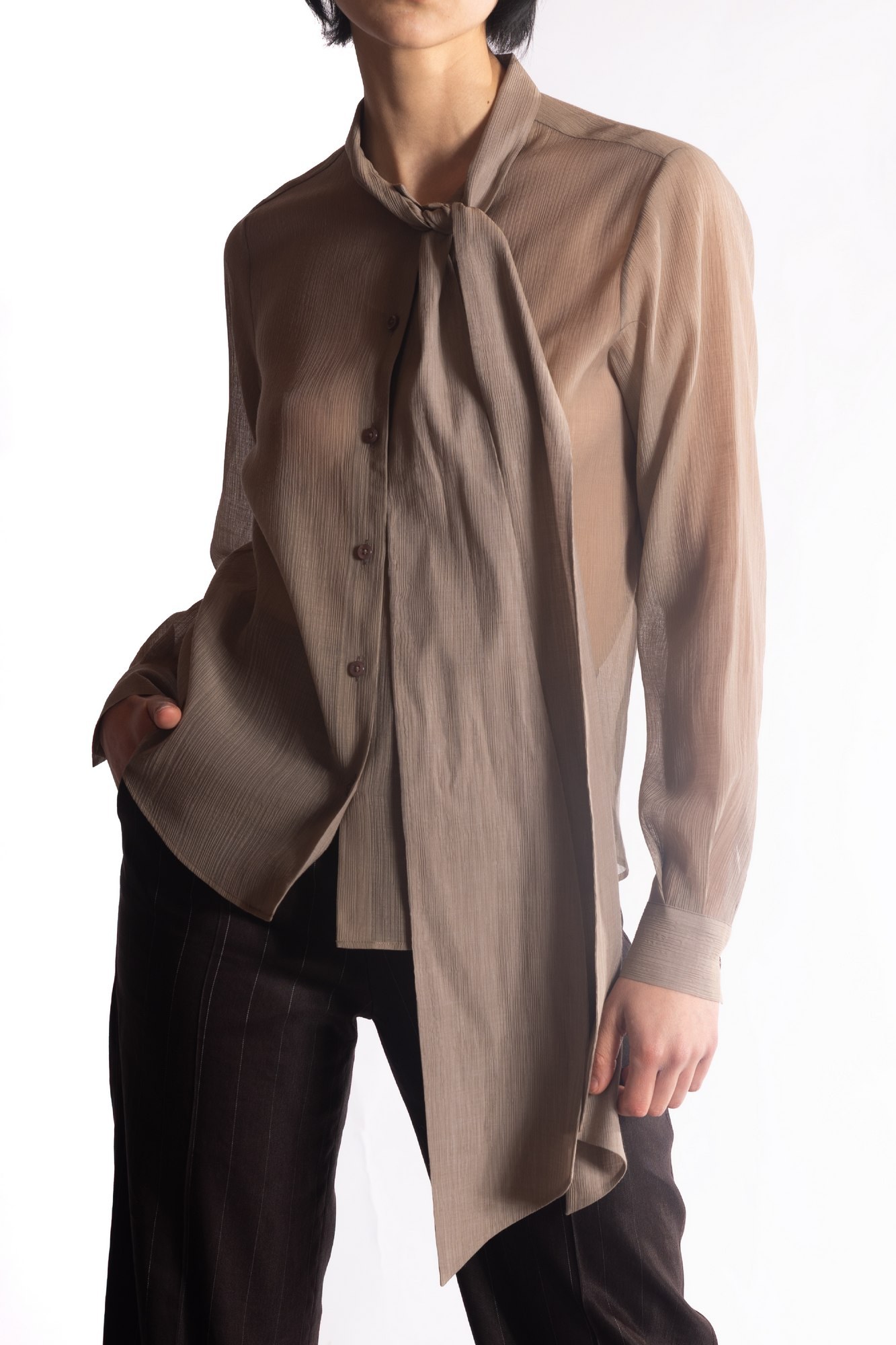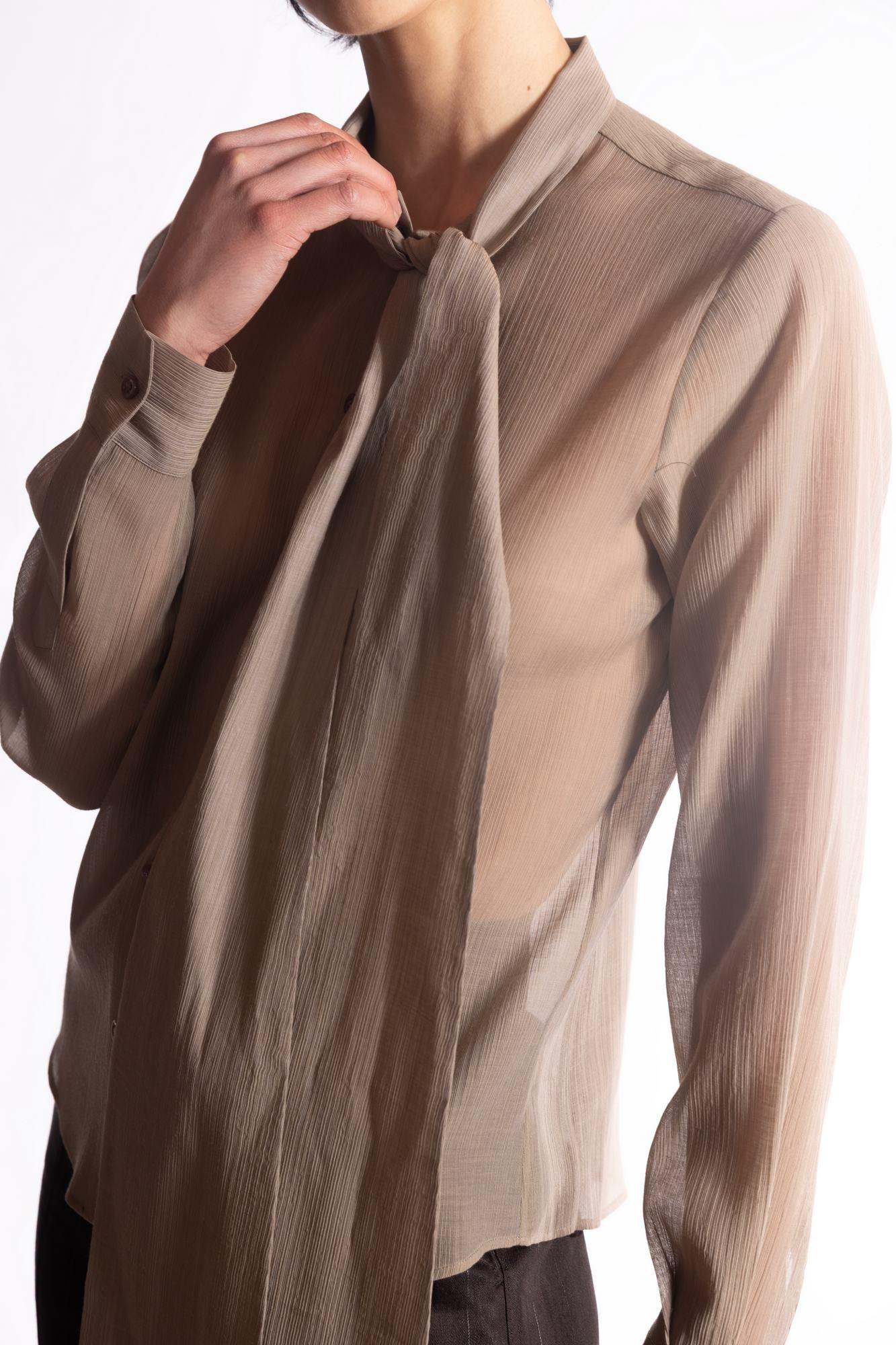 Camicia in chiffon semitrasparente con scollo con fiocco annodabile, chiusura frontale classica con bottoni tono su tono e maniche lunghe rifinite da polsini sottili.