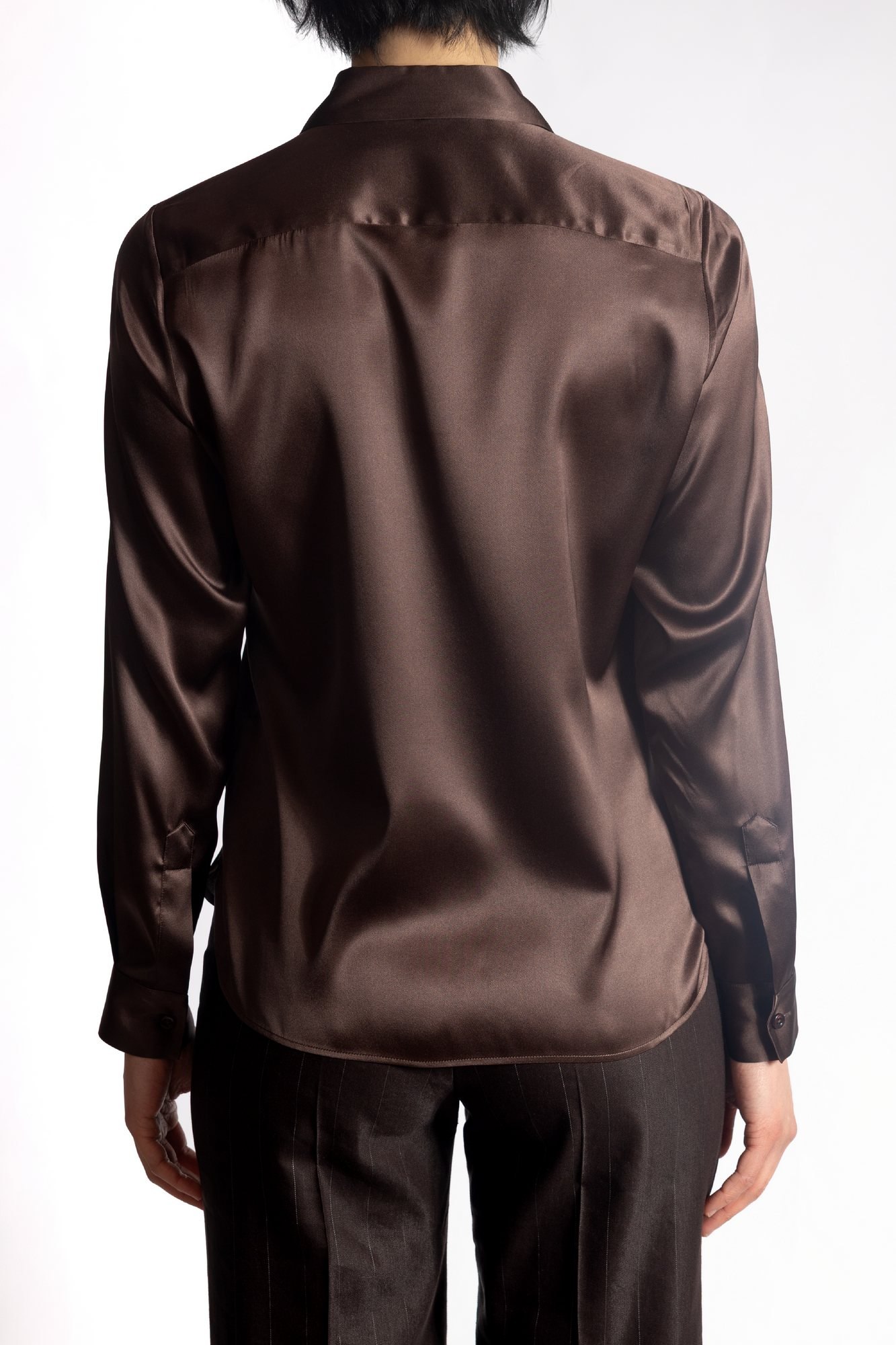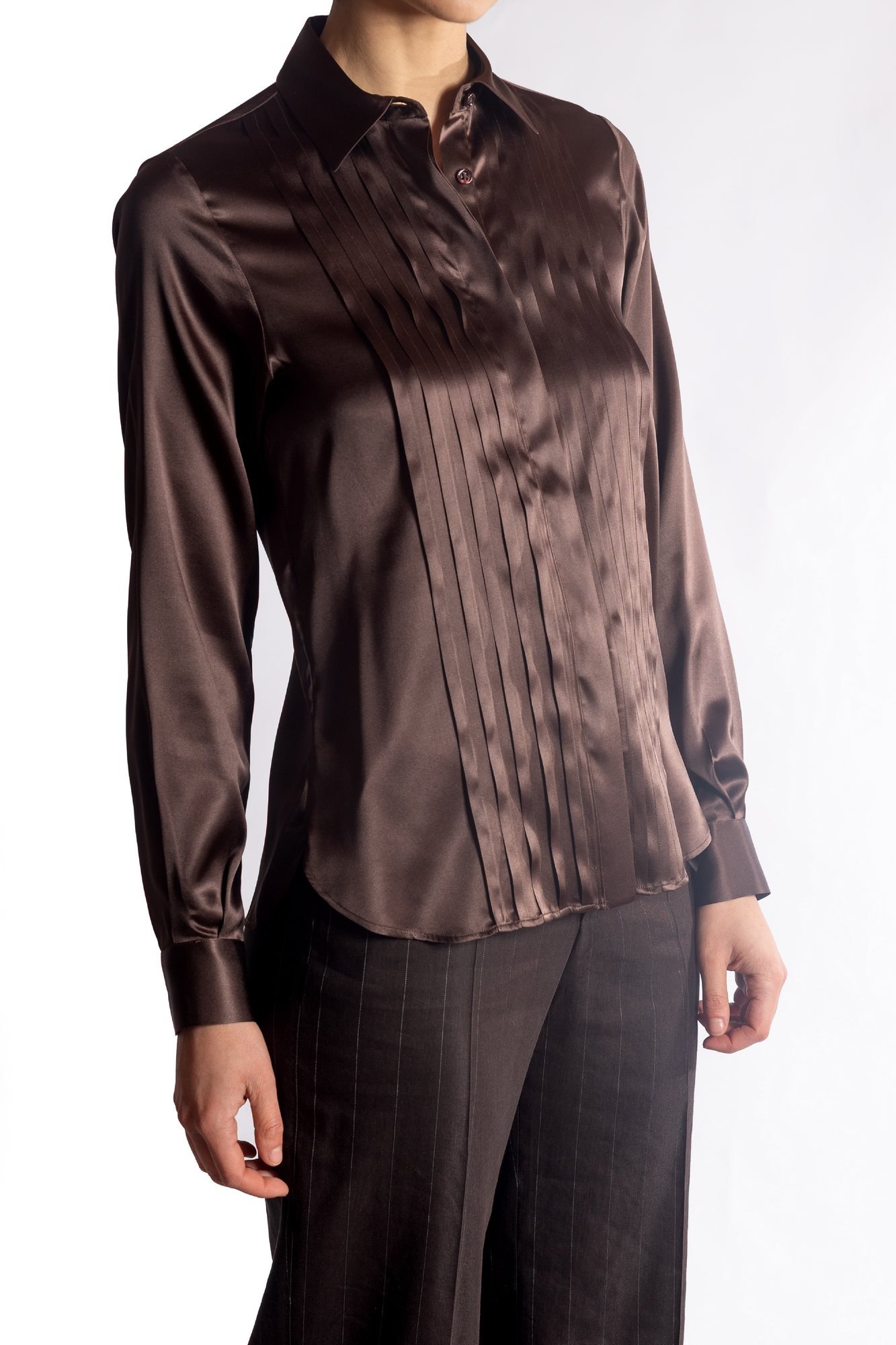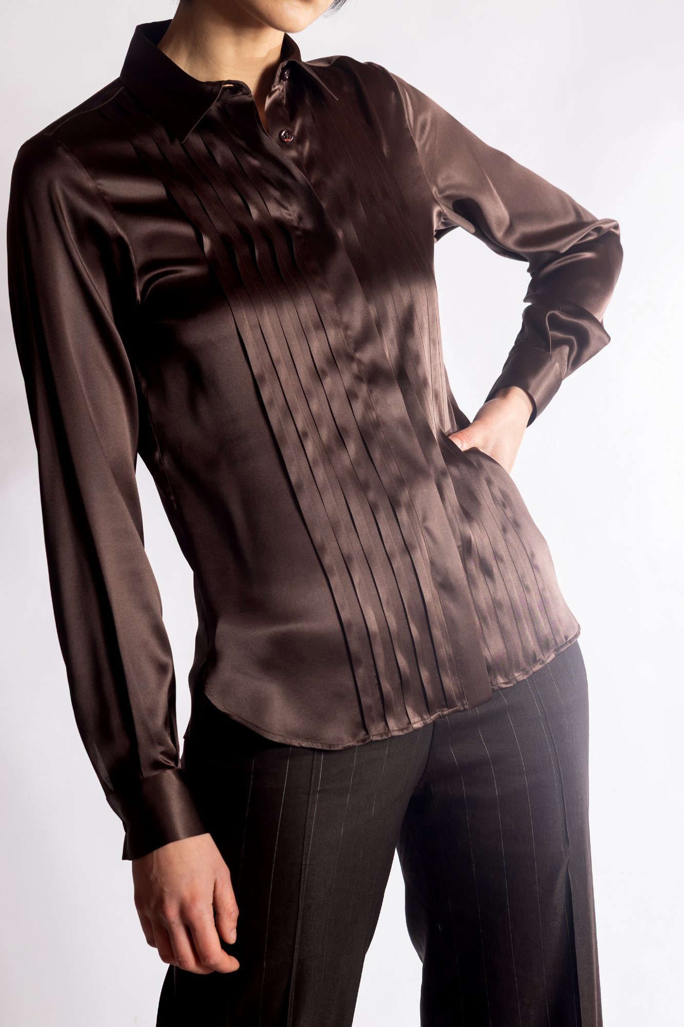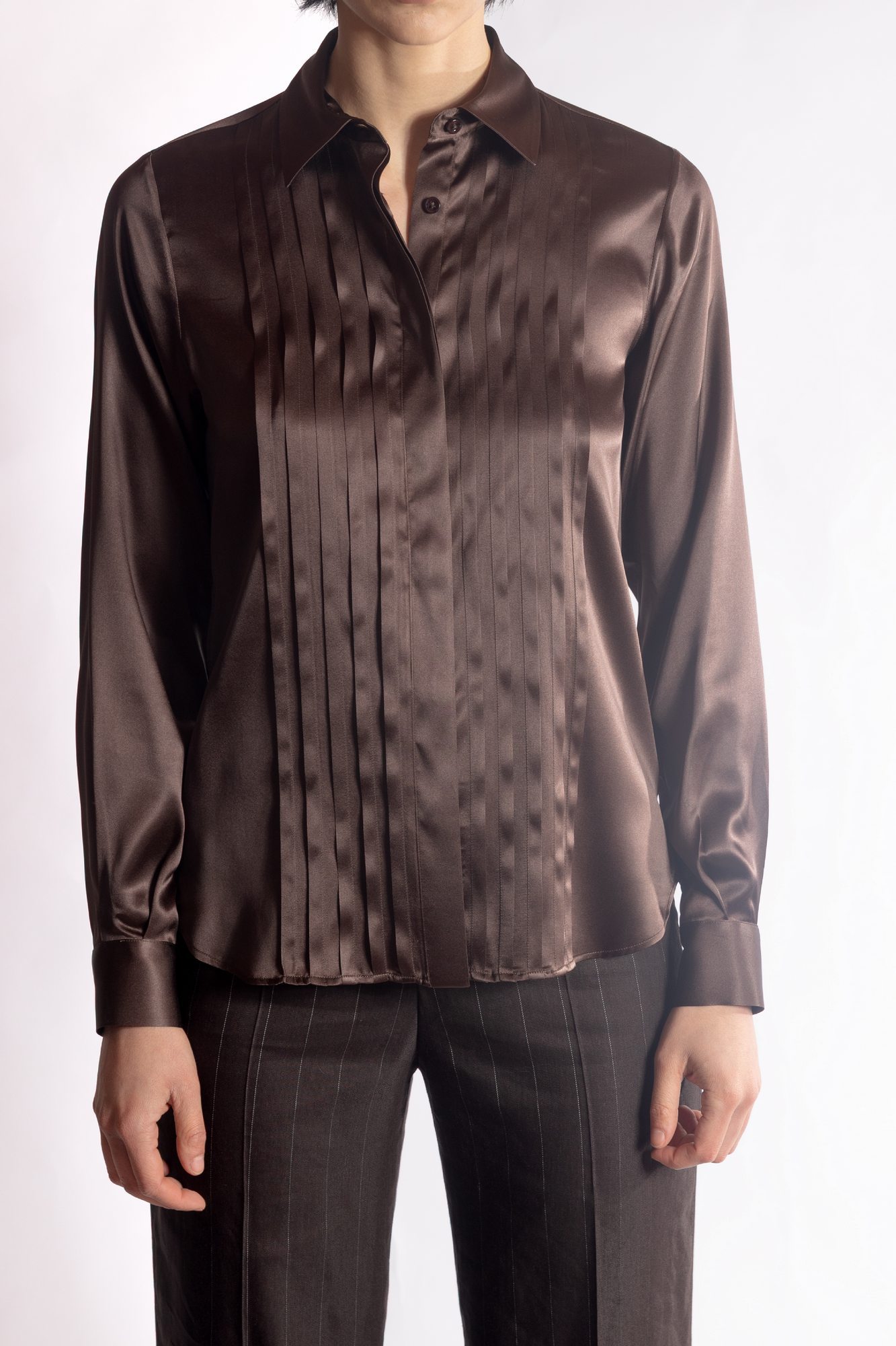Camicia in raso di seta con plissé frontale a piccole pieghe verticali, classico colletto a punta, chiusura con bottoni in tinta e linea leggermente arrotondata al fondo.
