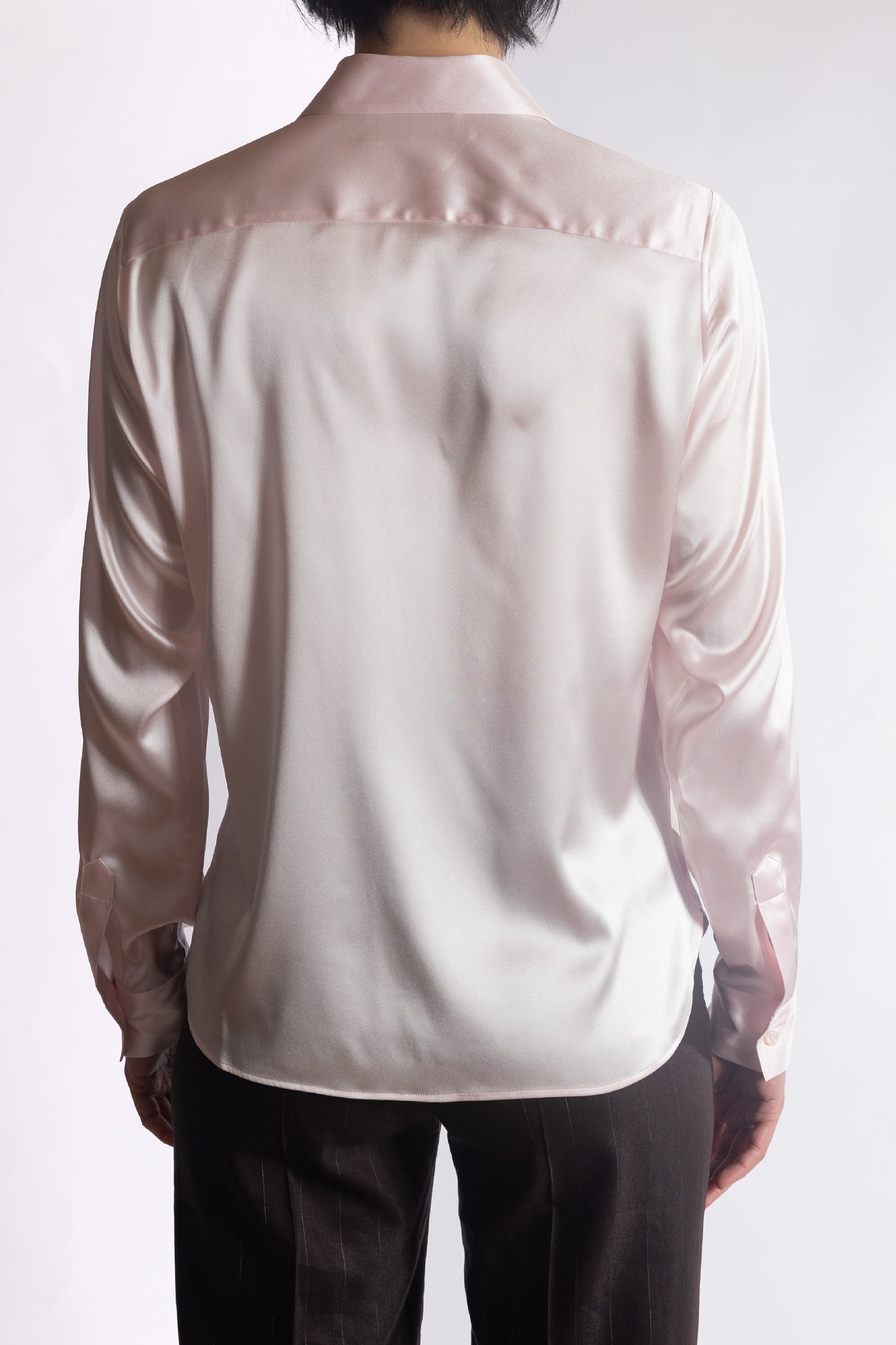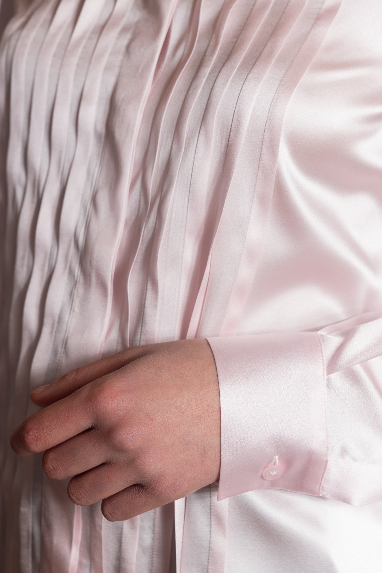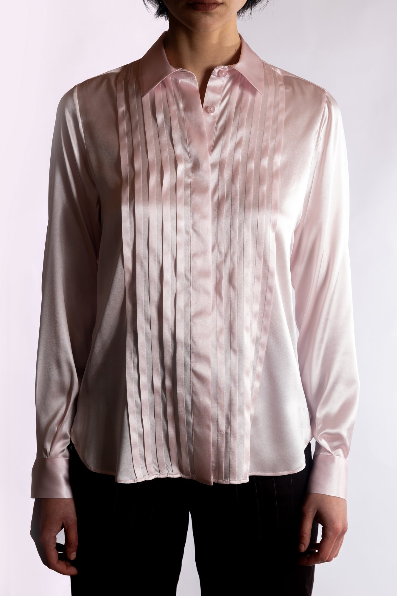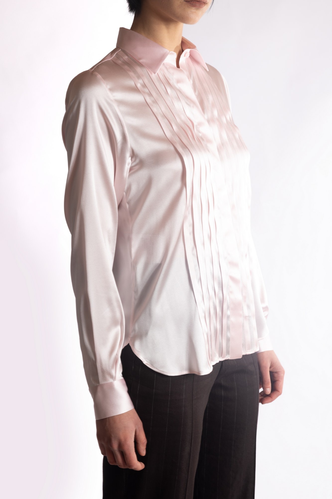 Camicia in raso di seta con plissé frontale a piccole pieghe verticali, classico colletto a punta, chiusura con bottoni in tinta e linea leggermente arrotondata al fondo.