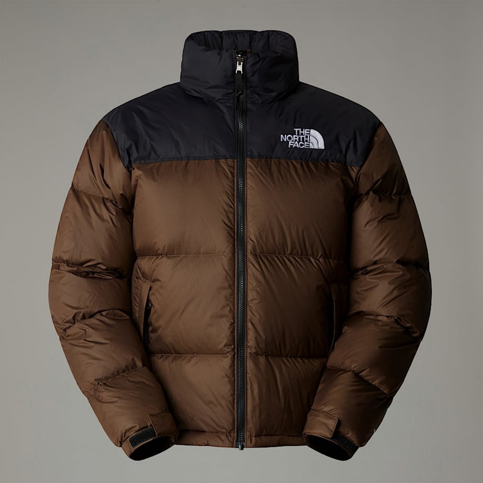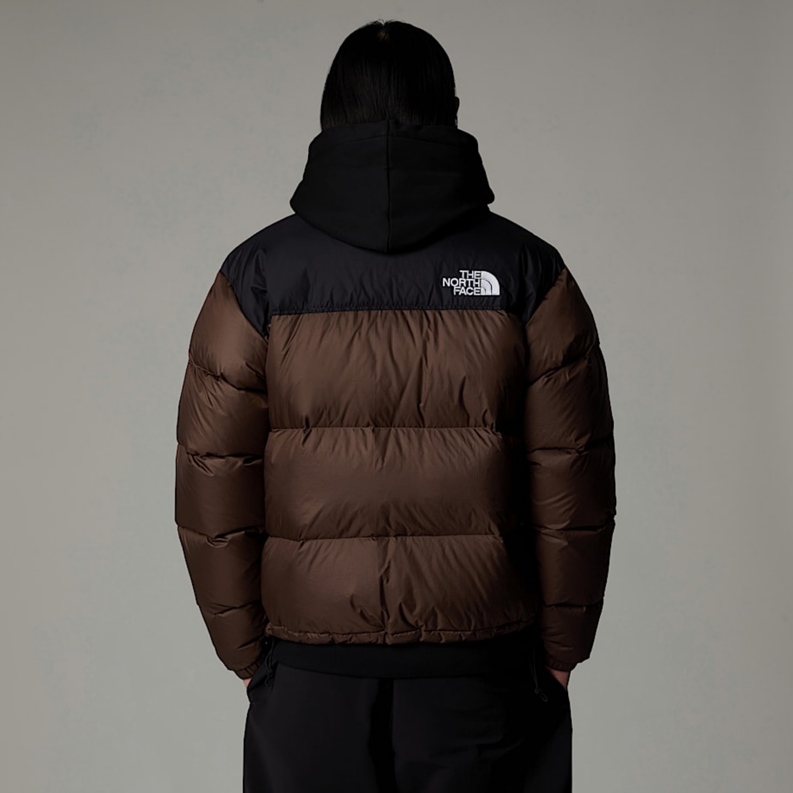 Giacca in ripstop con rivestimenti in taffetà su collo e carré, imbottitura in piumino doca, cappuccio fisso a tre pannelli ripiegato nel collo a listino e tasche per le mani con cerniera di sicurezza.