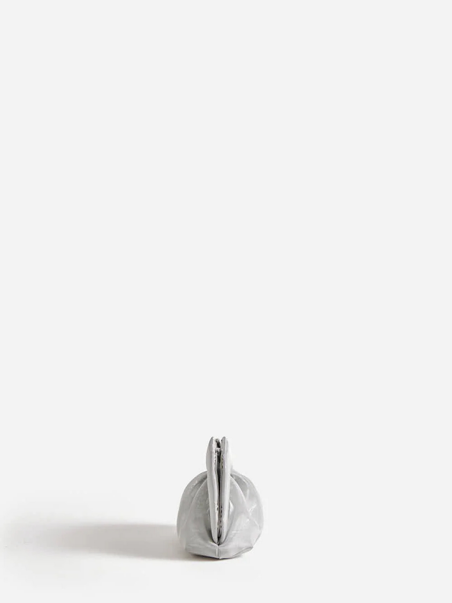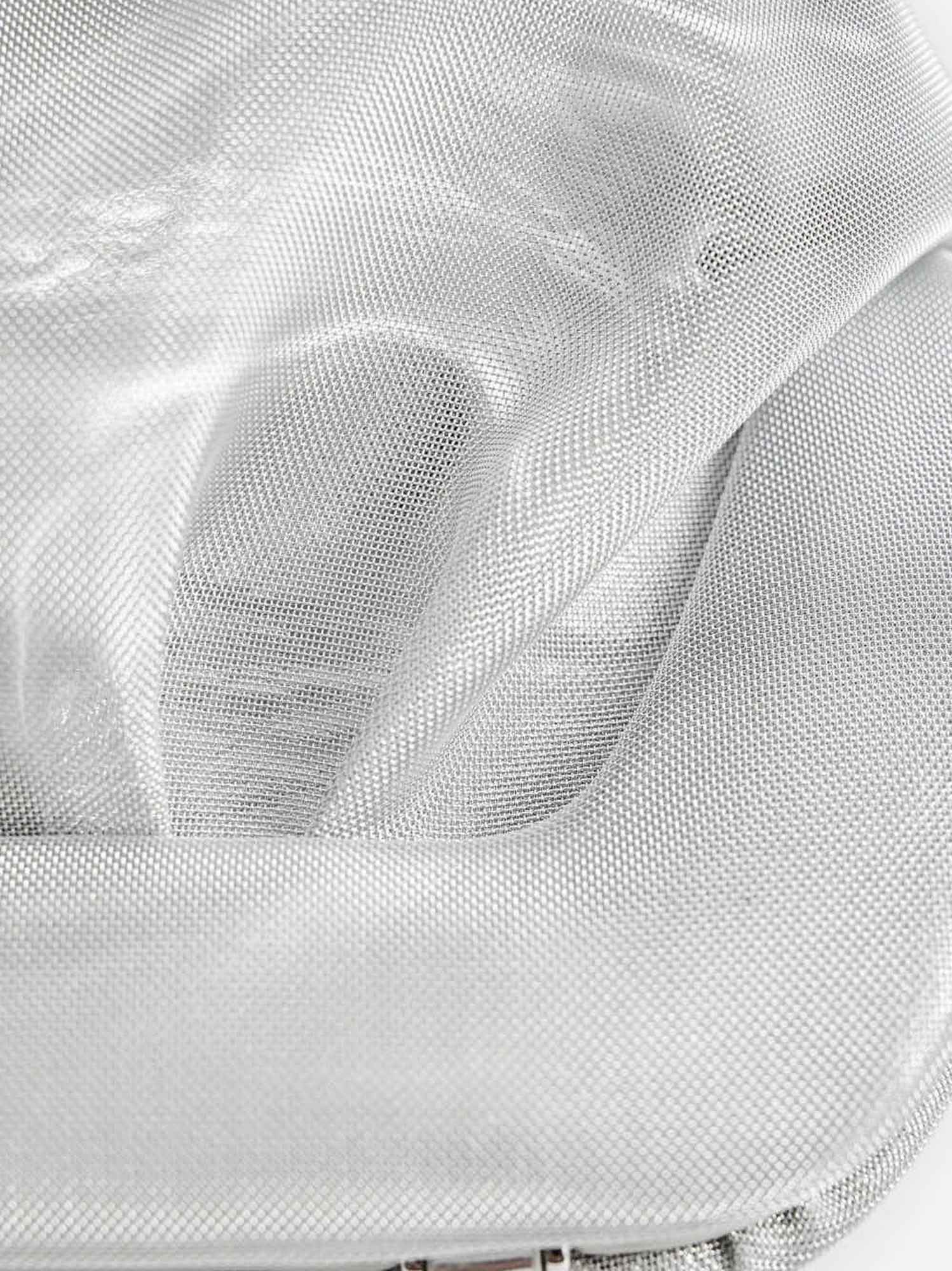 Borsa in tessuto vegano con lavorazione a rete laminata, chiusura magnetica e tracolla removibile.