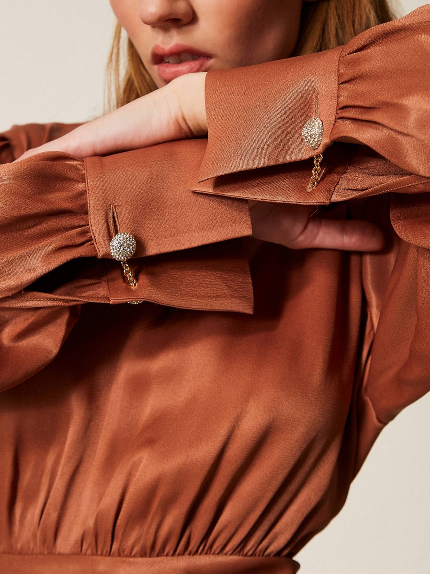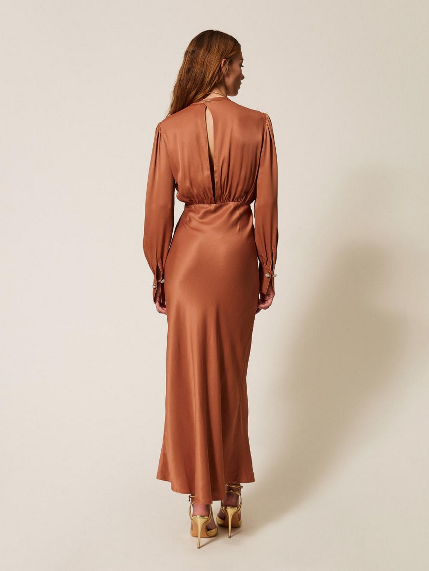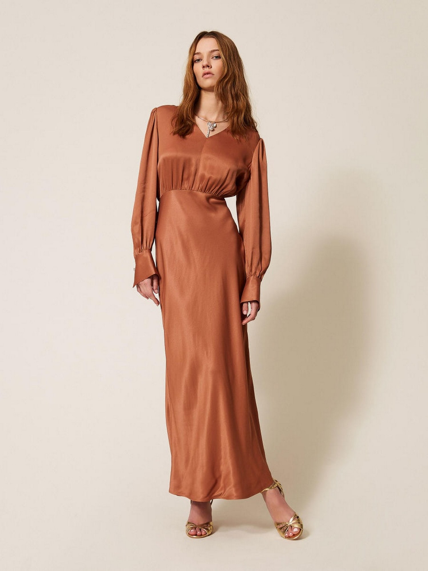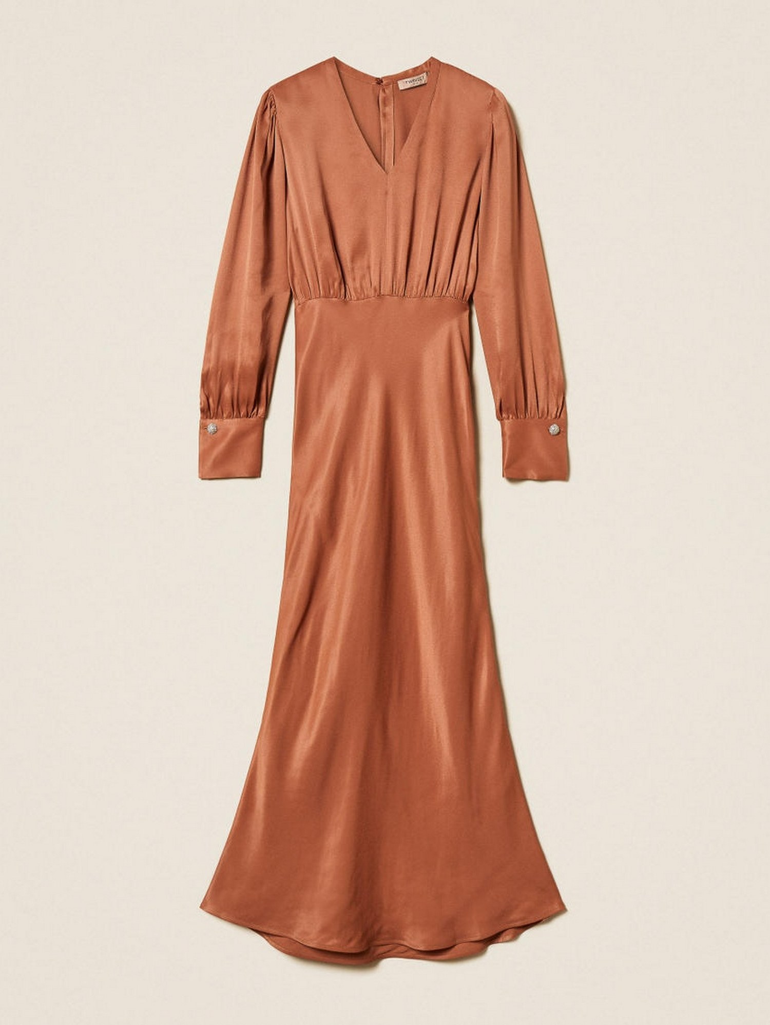 Abito lungo in raso di viscosa con arricciatura in vita, collo tondo, maniche lunghe morbide con polsino e bottone, taglio in vita, chiusura con zip al fianco e apertura a goccia con bottone sul retro.