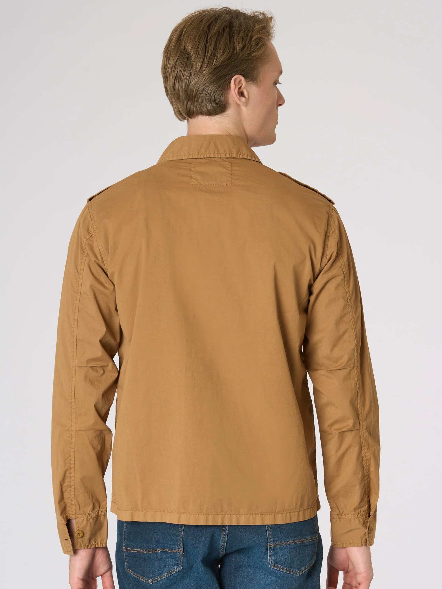 Giacca in cotone popeline stretch con chiusura frontale con bottoni, colletto classico, spalline con bottone, polsini regolabili e tasche applicate sul petto con patta.