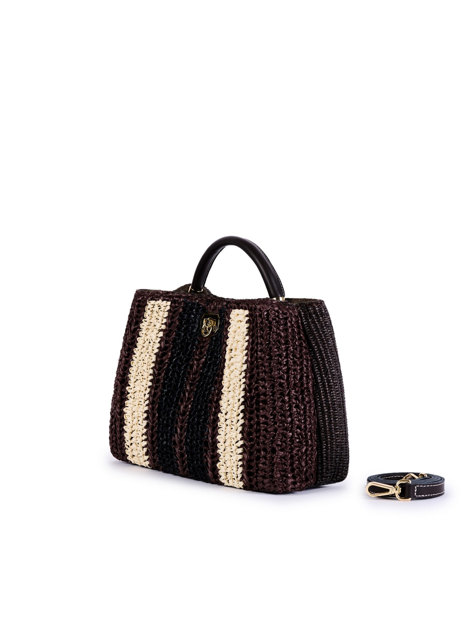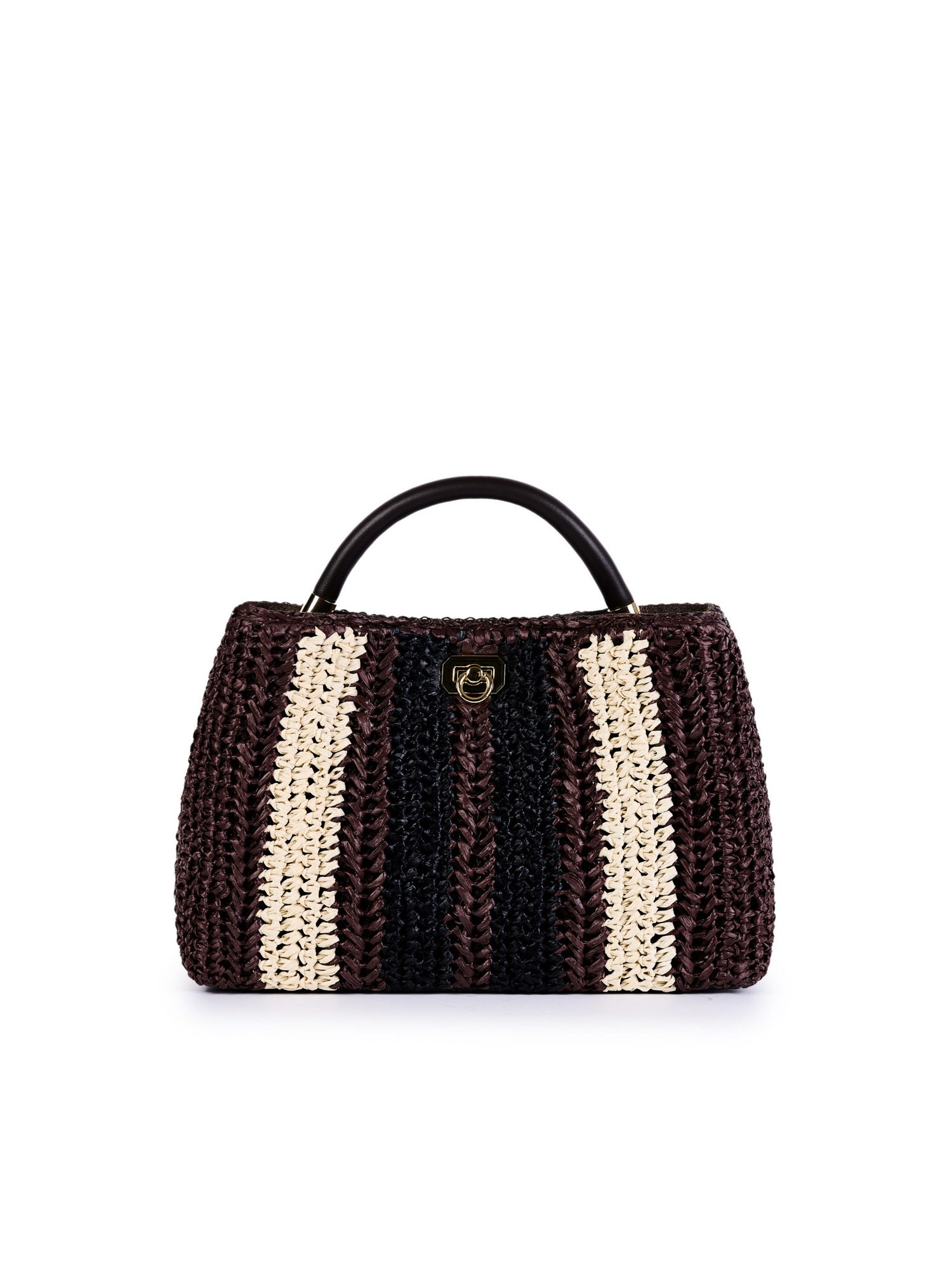 Borsa in rafia crochet con manico in pelle, chiusura in metallo, tasca interna intramezzata che divide linterno della borsa in due scomparti e tracolla in pelle.