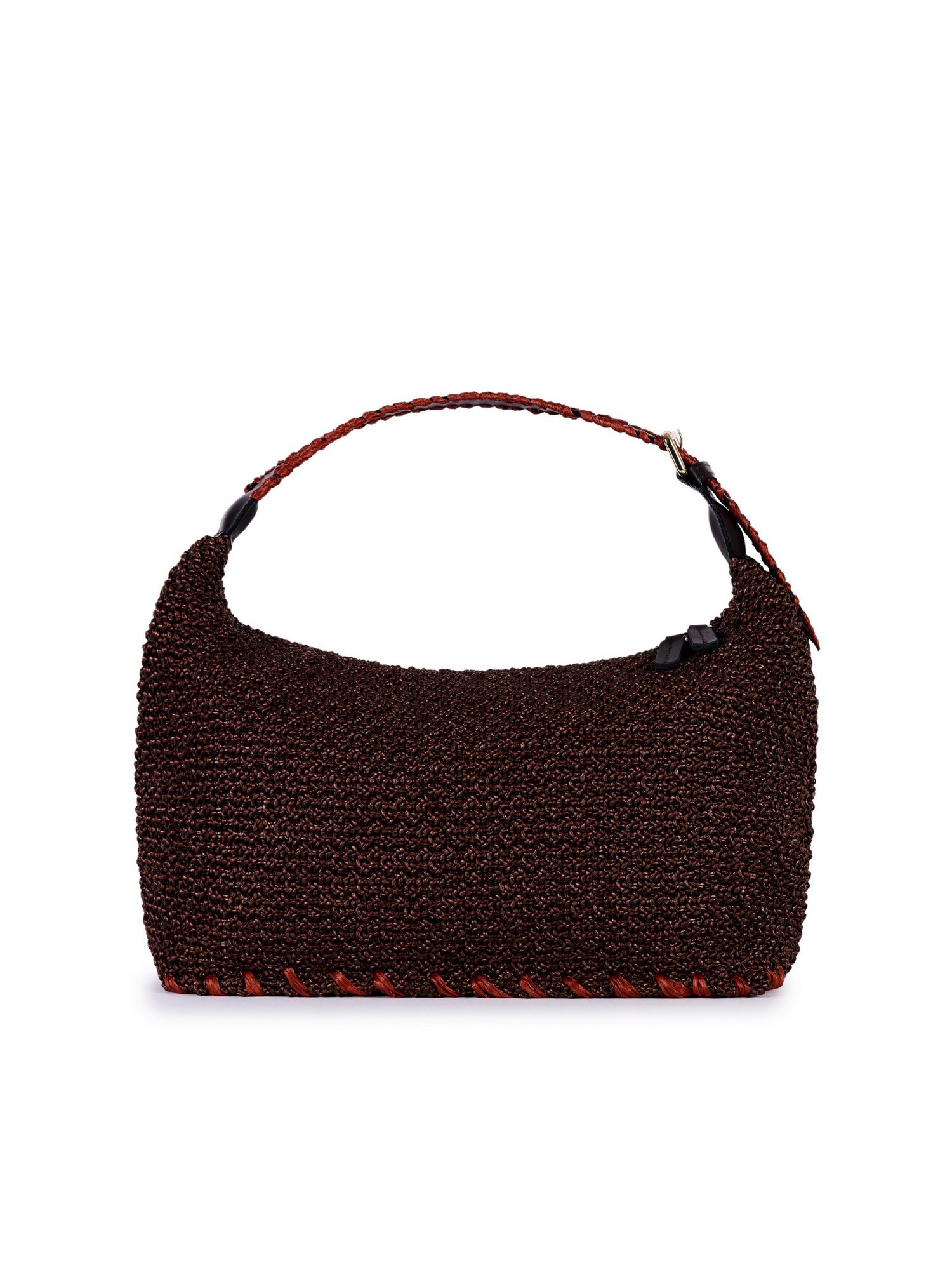 Borsa in rafia con manico regolabile in pelle infilato a mano, chiusura con zip, tasca interna.