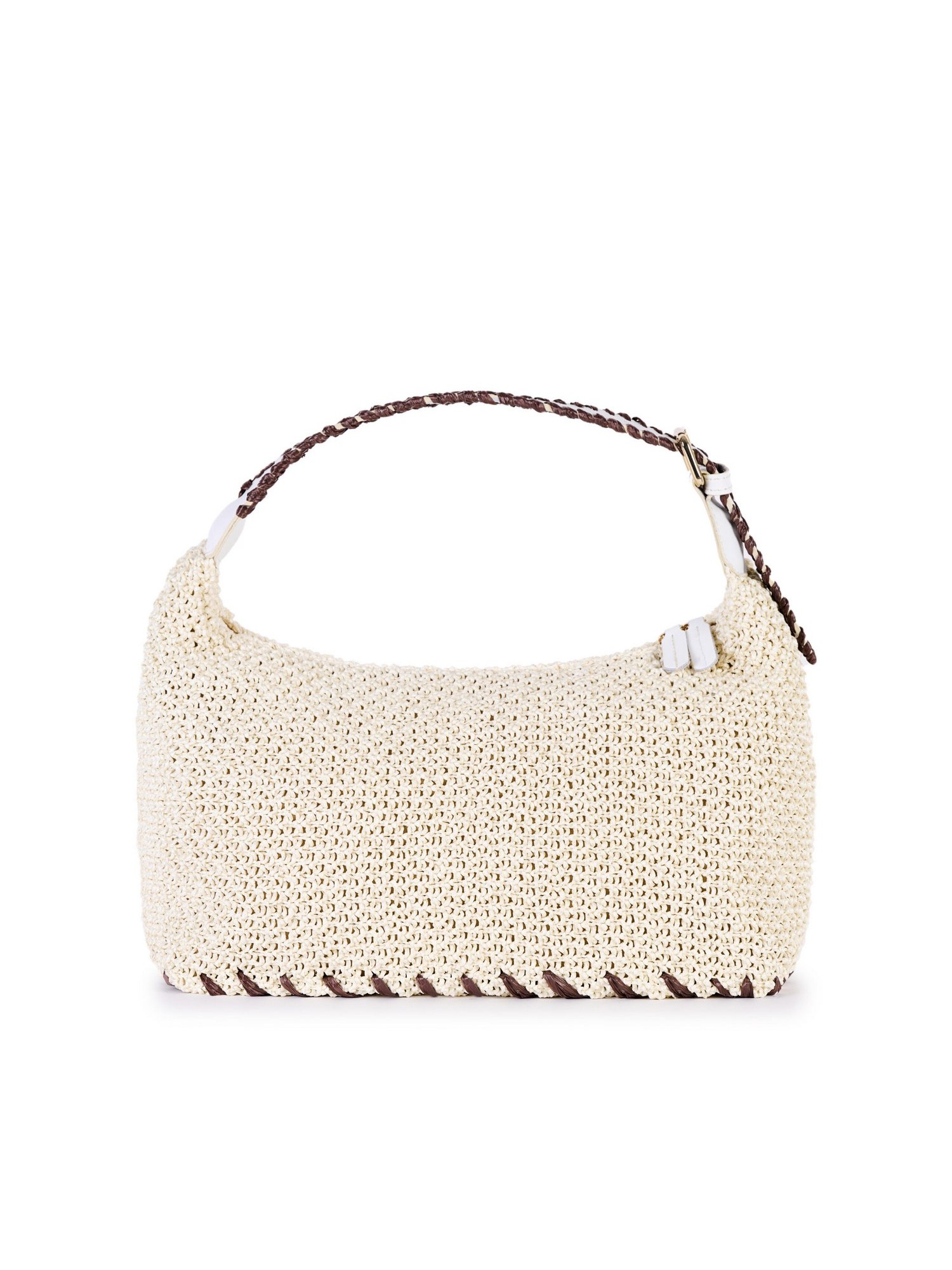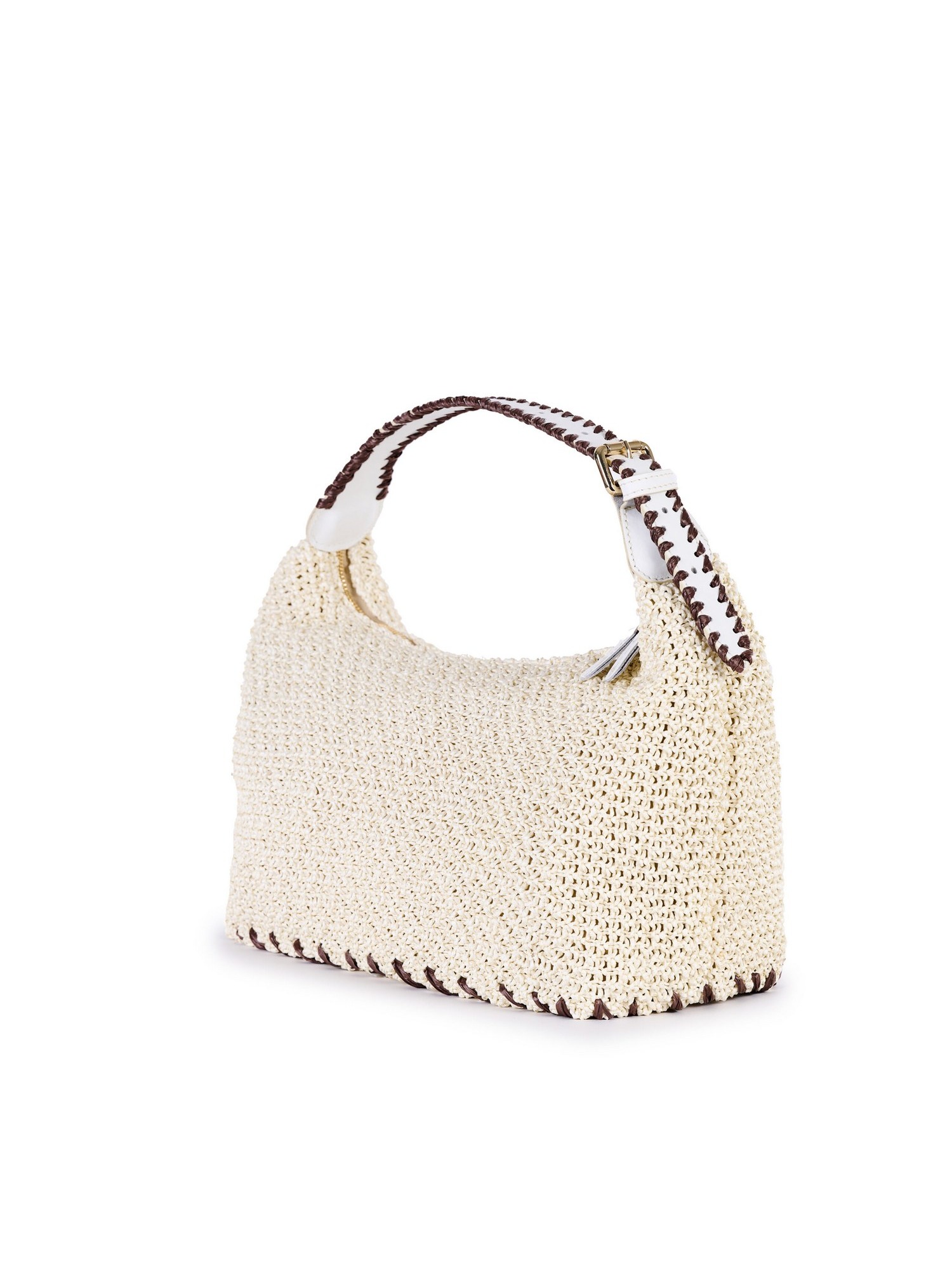 Borsa in rafia con manico regolabile in pelle infilato a mano, chiusura con zip, tasca interna.