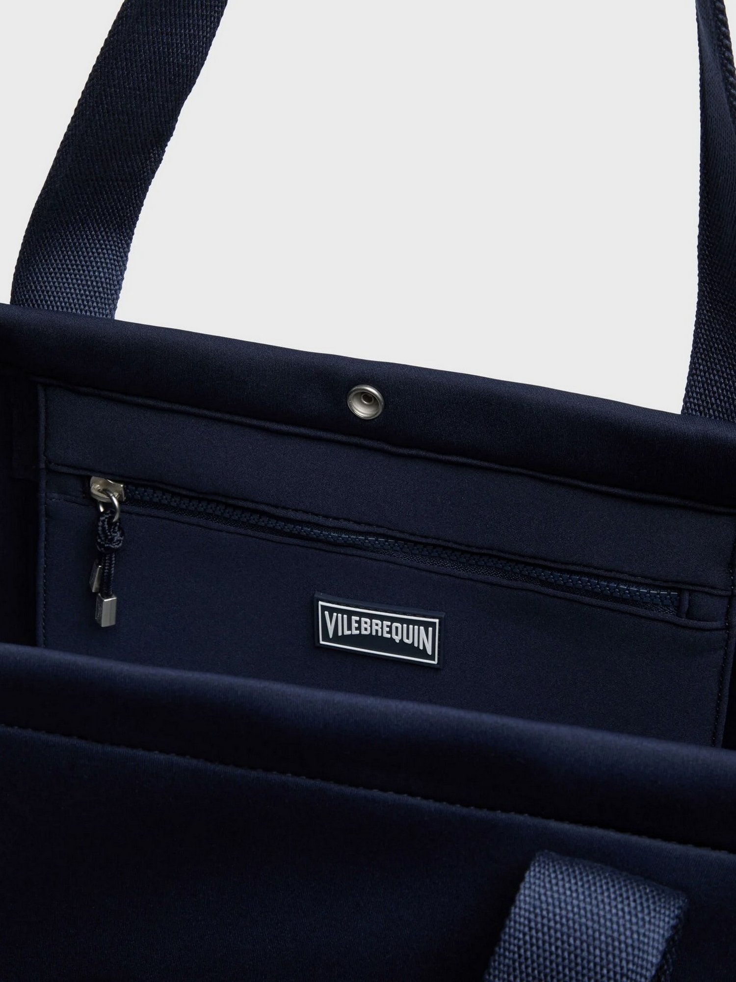 Borsa da spiaggia in neoprene stampato con due manici in cotone, chiusura con zip, due estremità in zamak con incisione e bottoni a pressione interni ed esterni per ripiegarla.