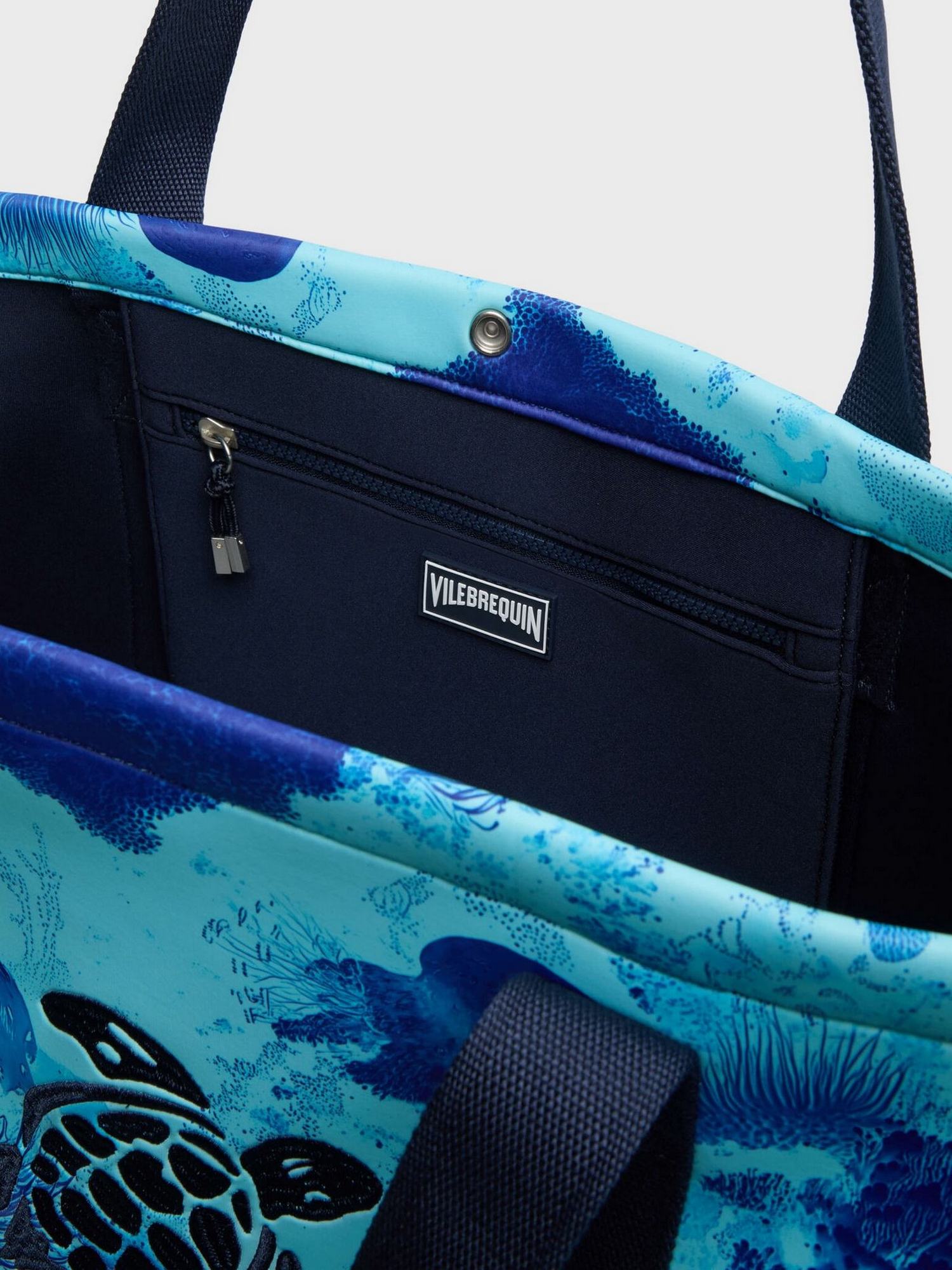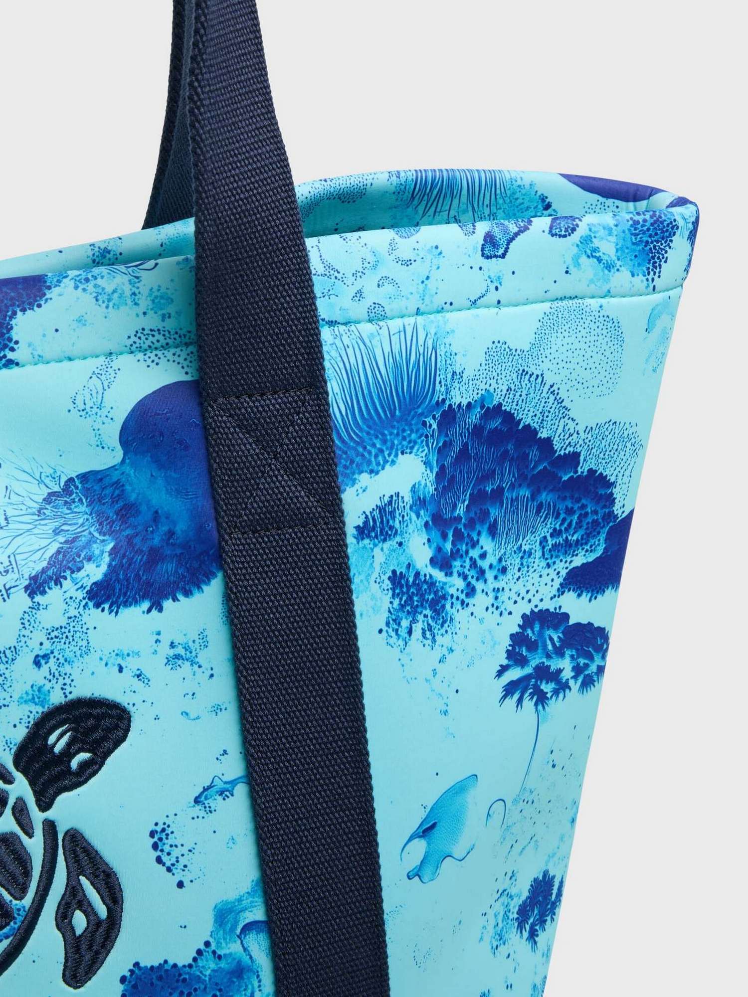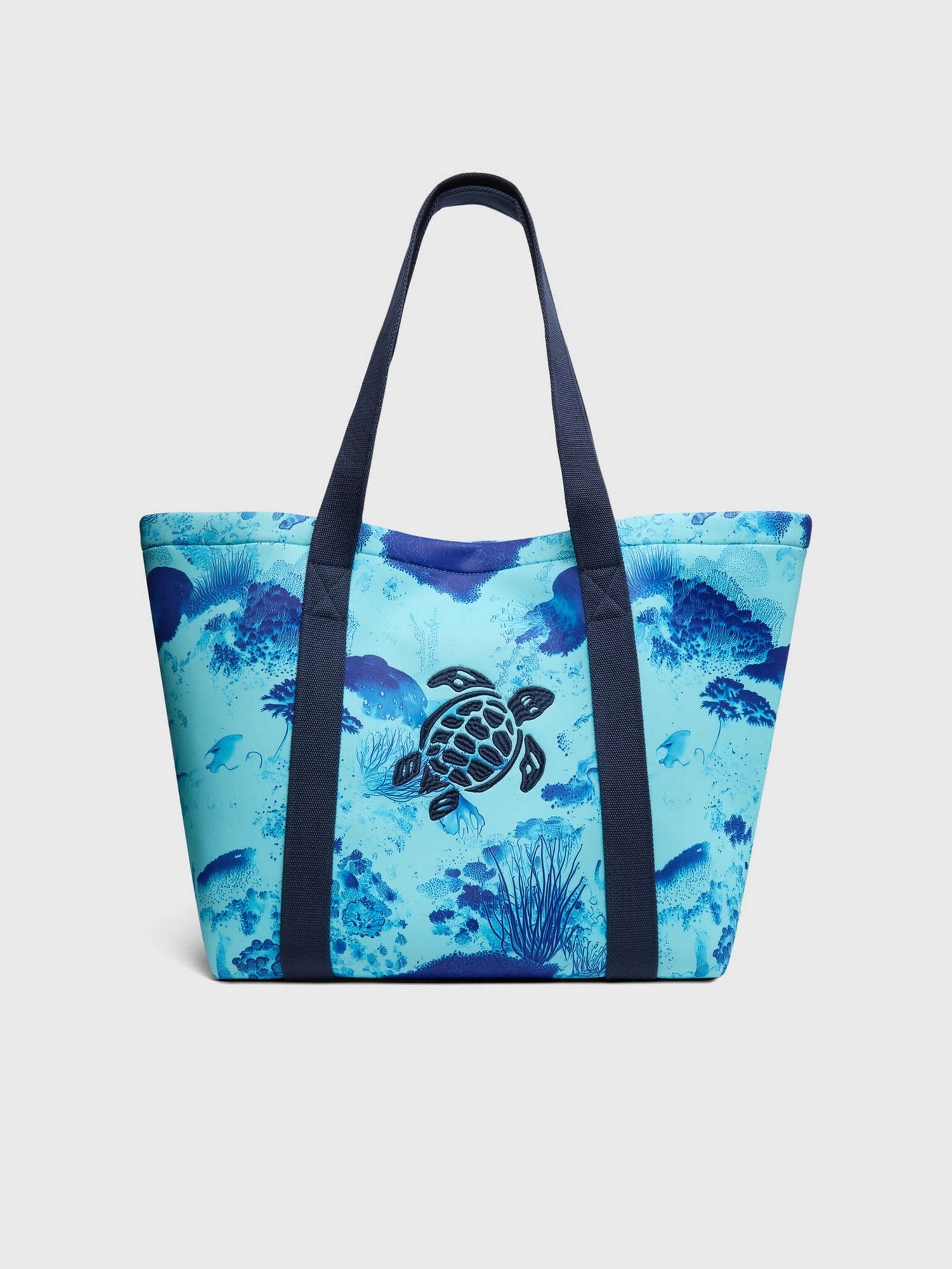 Borsa da spiaggia in neoprene stampato con due manici in cotone, chiusura con zip, due estremità in zamak con incisione e bottoni a pressione interni ed esterni per ripiegarla.