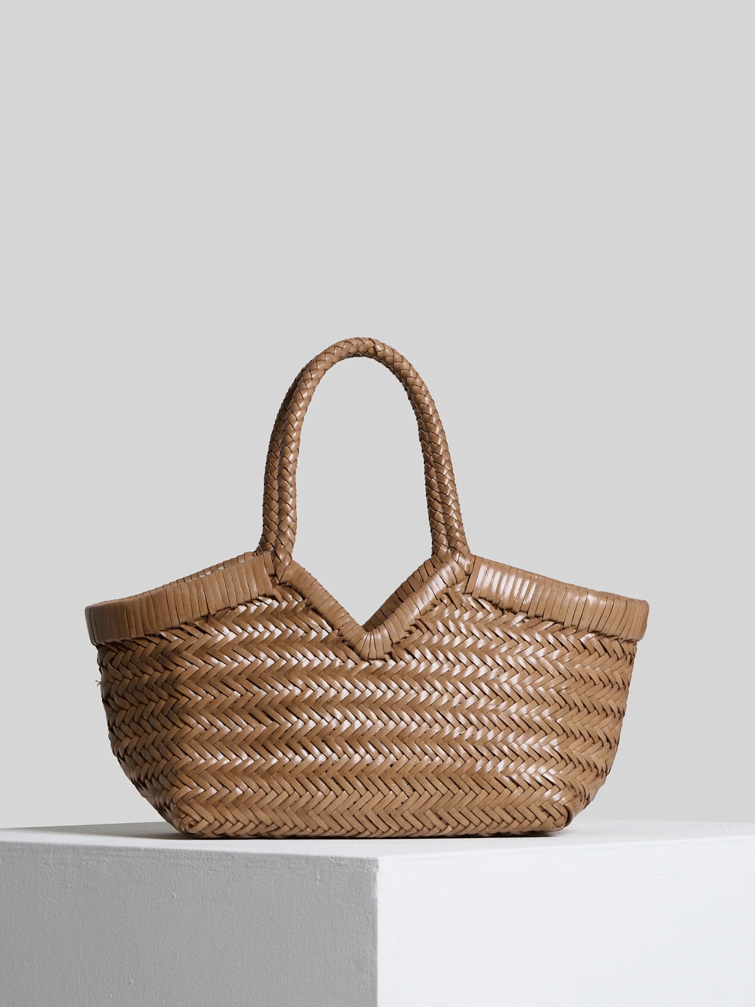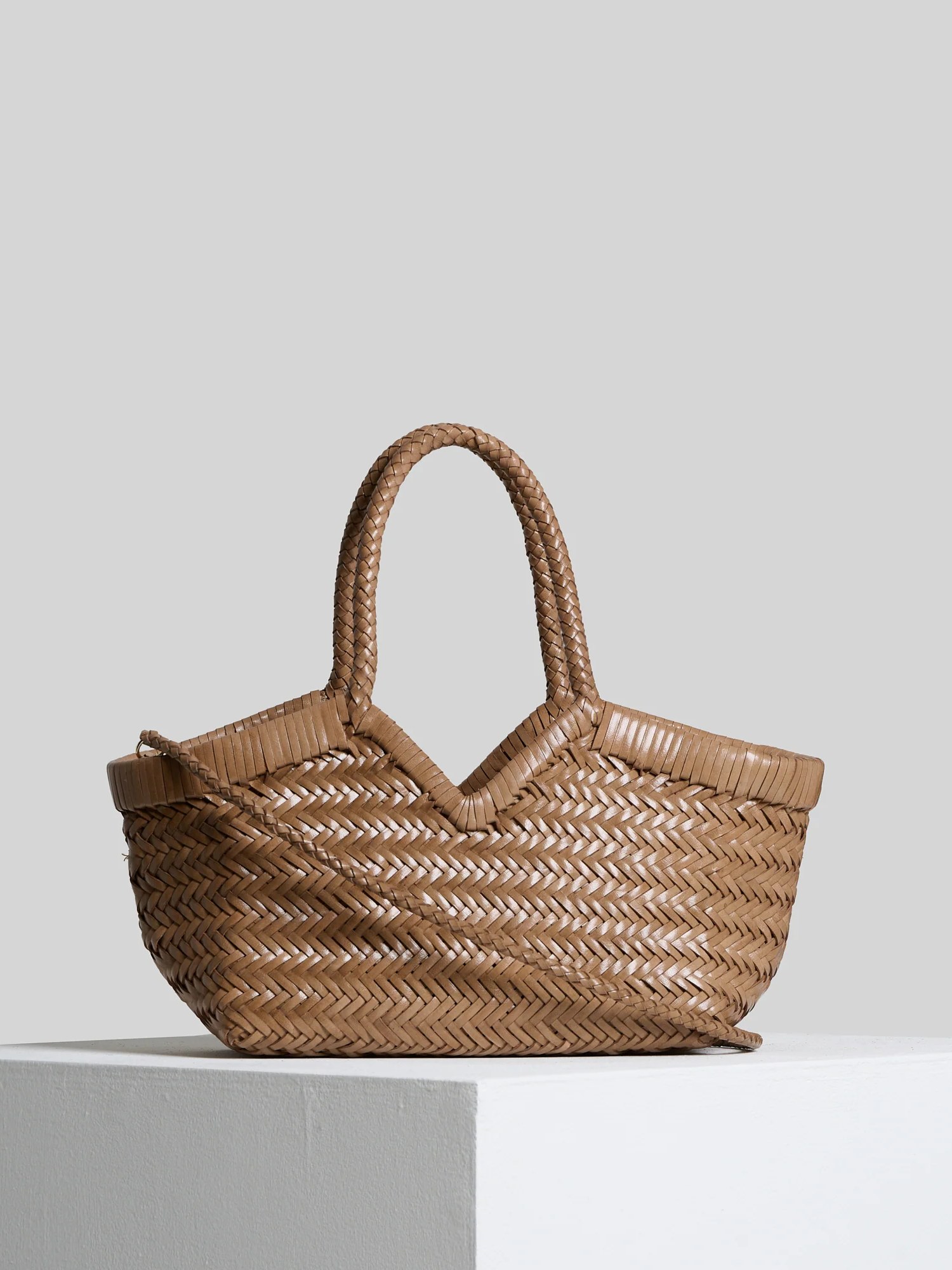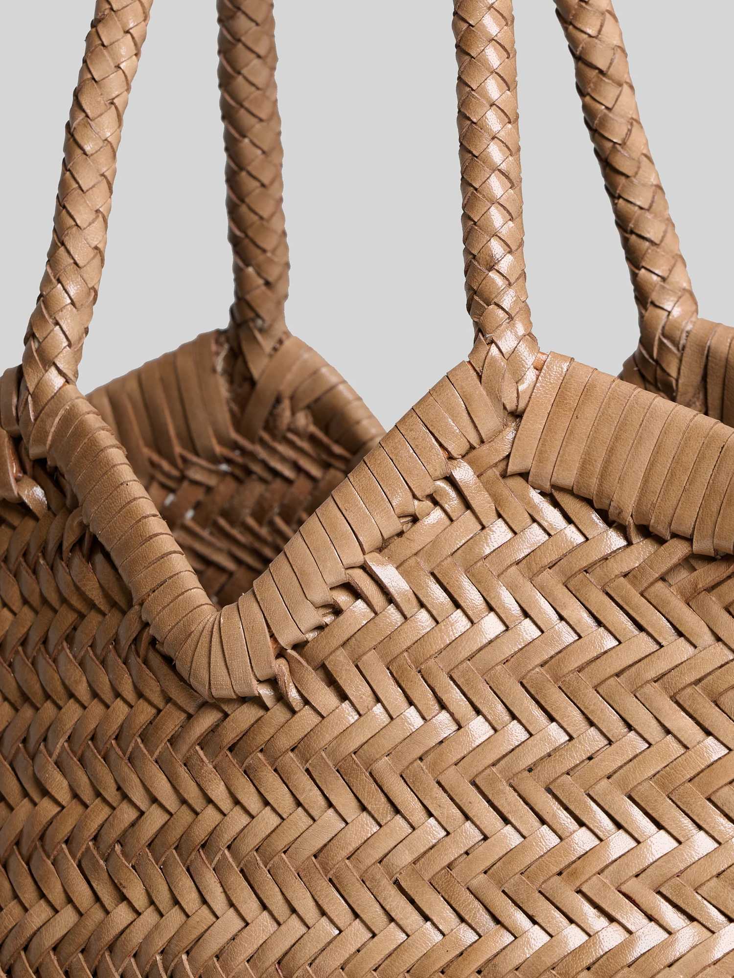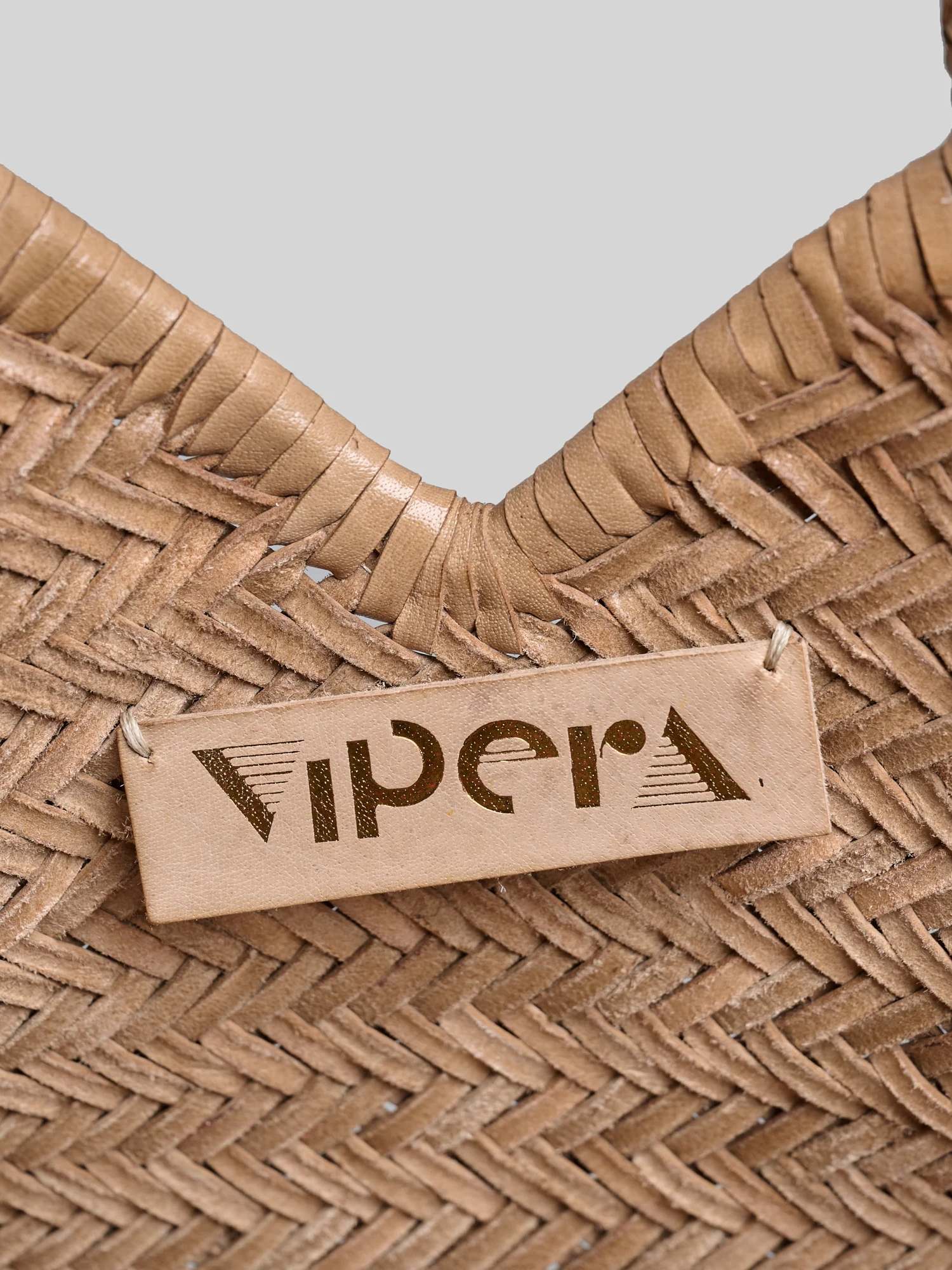 Borsa intrecciata a mano con singola tasca interna rimovibile in tela e tracolla in pelle rimovibile.